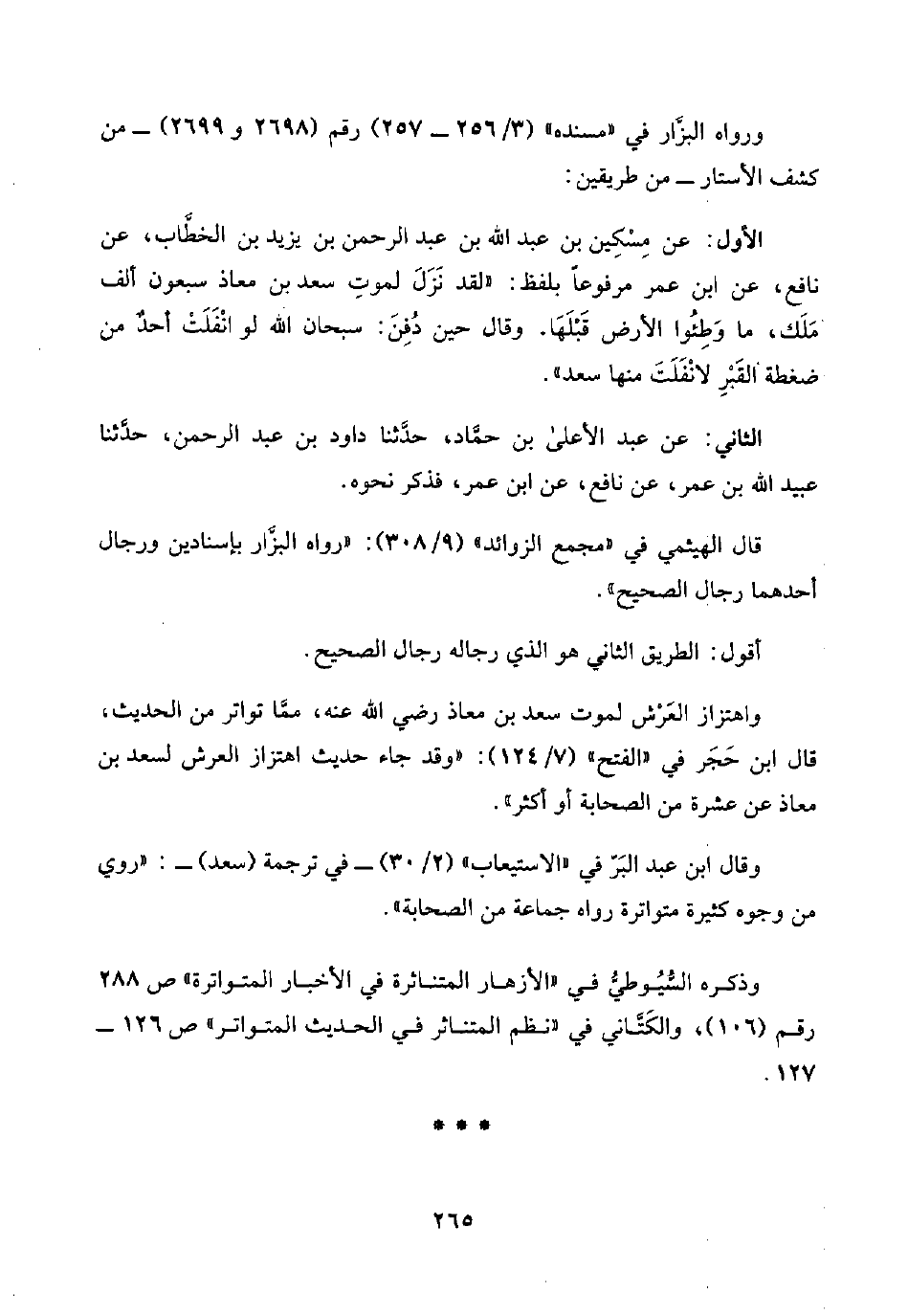 واهتزاز العَرْش لموت سعد بن معاذ رضي اللَّه عنه، ممَّا تواتر من الحديث، قال ابن حَجَر في "الفتح" (٧/ ١٢٤): "وقد جاء حديث اهتزاز العرش لسعد بن معاذ عن عشرة من الصحابة أو أكثر".