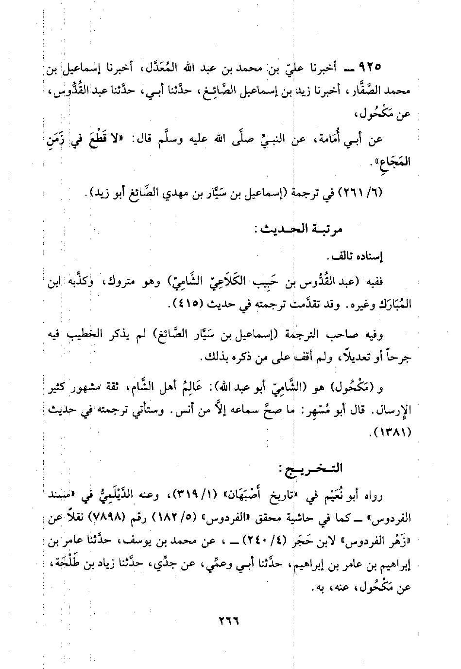 ٩٢٥ - أخبرنا عليّ بن محمد بن عبد اللَّه المُعَدَّل، أخبرنا إسماعيل بن محمد الصَّفَّار، أخبرنا زيد بن إسماعيل الصائِغ، حدَّثنا أبي، حدَّثنا عبد القُدُّوس، عن مَكْحُول،