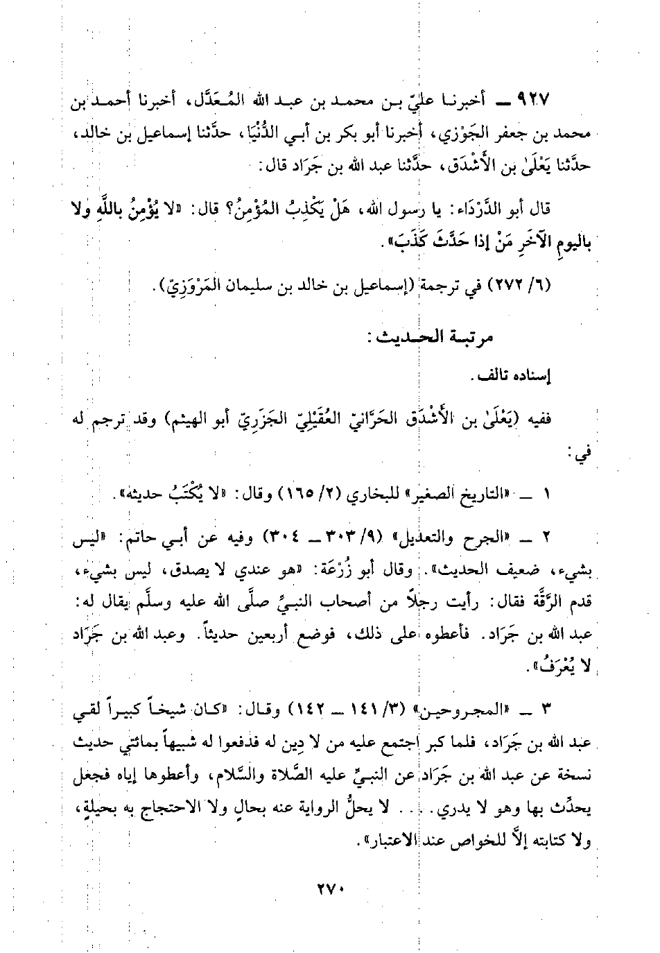 ٢ - "الجرح والتعديل" (٩/ ٣٠٣ - ٣٠٤) وفيه عن أبي حاتم: "ليس بشيء، ضعيف الحديث". وقال أبو زُرْعَة: "هو عندي لا يصدق، ليس بشيء، قدم الرَّقَّة فقال: رأيت رجلًا من أصحاب النبيِّ صلَّى اللَّه عليه وسلَّم يقال له: عبد اللَّه بن جَرَاد. فأعطوه على ذلك، فوضع أربعين حديثًا. وعبد اللَّه بن جَرَاد لا يُعْرَفُ".