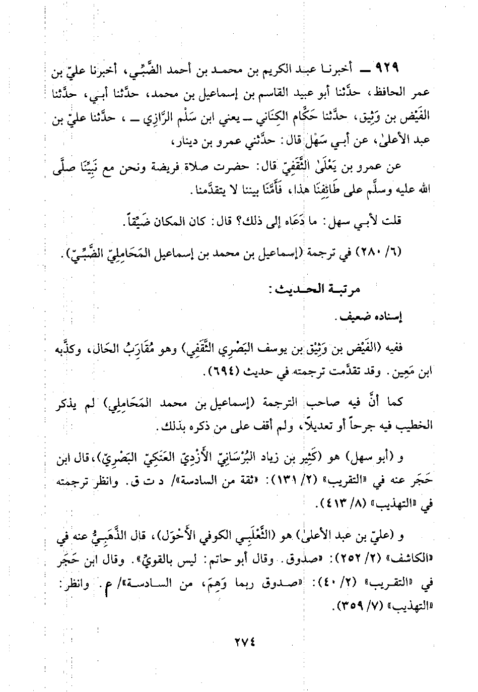 ٩٢٩ - أخبرنا عبد الكريم بن محمد بن أحمد الضَّبِّيّ، أخبرنا عليّ بن عمر الحافظ، حدَّثنا أبو عبيد القاسم بن إسماعيل بن محمد، حدَّثنا أبي، حدَّثنا الفيض بن وَثِيق، حدَّثنا حَكَّام الكِنَاني -يعني ابن سَلْم الرَّازي-، حدَّثنا عليّ بن عبد الأعلى، عن أبي سَهْل قال: حدَّثني عمرو بن دينار،