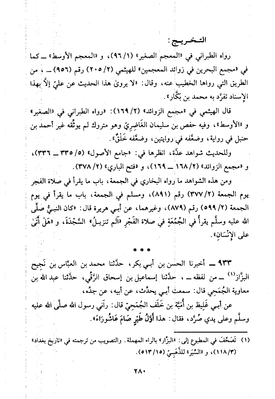 ومن هذه الشواهد ما رواه البخاري في الجمعة، باب ما يقرأ في صلاة الفجر يوم الجمعة (٢/ ٣٧٧) رقم (٨٩١)، ومسلم في الجمعة، باب ما يقرأ في يوم الجمعة (٢/ ٥٩٩) رقم (٨٧٩)، وغيرهما، عن أبي هريرة قال: "كان النبيُّ صلَّى اللَّه عليه وسلَّم يقرأُ في الجُمُعَةِ في صلاة الفَجْرِ "الم تنزيلُ" السَّجْدَةَ، و {هَلْ أَتَى عَلَى الْإِنْسَانِ} "