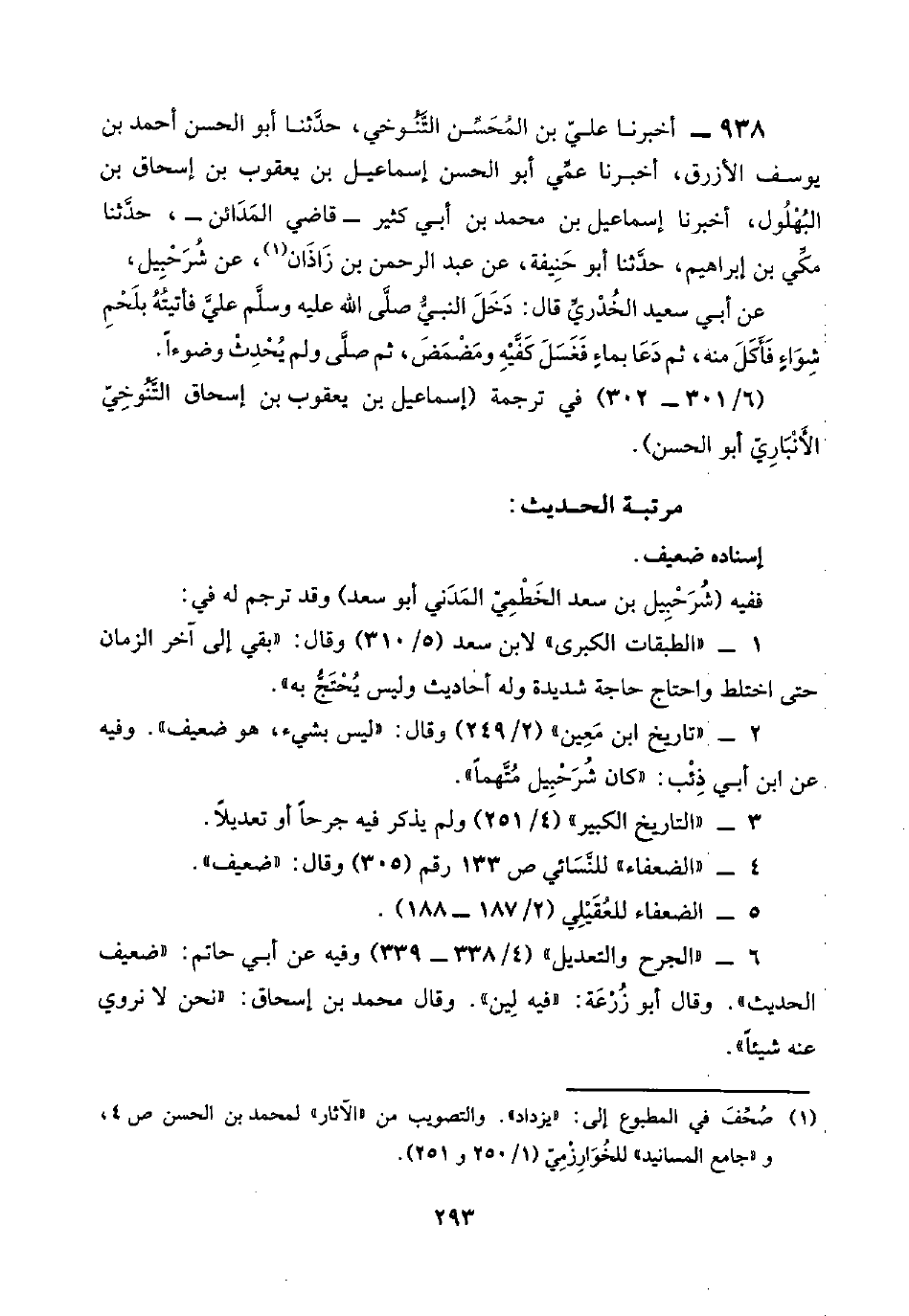 ٩٣٨ - أخبرنا عليّ بن المُحَسِّن التَّنُوخي، حدَّثنا أبو الحسن أحمد بن يوسف الأَزْرَق، أخبرنا عمِّي أبو الحسن إسماعيل بن يعقوب بن إسحاق بن البُهْلُول، أخبرنا إسماعيل بن محمد بن أبي كثير -قاضي المَدَائن-، حدَّثنا مكِّي بن إبراهيم، حدَّثنا أبو حَنِيفة، عن عبد الرحمن بن زَاذَان (¬١)، عن شُرَحْبِيل،