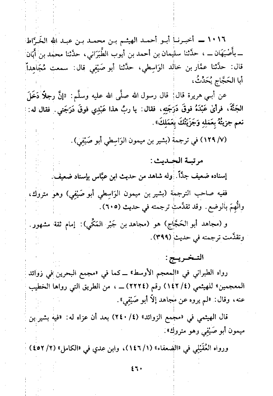 ١٠١٦ - أخبرنا أبو أحمد الهيثم بن محمد بن عبد اللَّه الخَرَّاط -بأَصْبَهَان-، حدَّثنا سليمان بن أحمد بن أيوب الطَّبِرَاني، حدَّثنا محمد بن أَبَان قال: حدَّثنا عمَّار بن خالد الوَاسِطي، حدَّثنا أبو صَيْفِي قال: سمعت مُجَاهِدًا أبا الحَجَّاج يُحَدِّثُ،