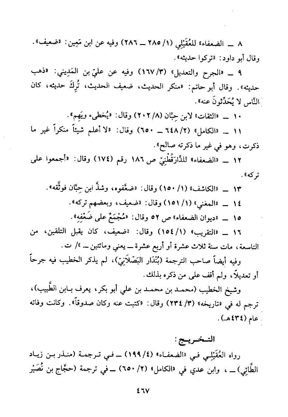 ٨ - "الضعفاء" للعُقَيْلِي (١/ ٢٨٥ - ٢٨٦) وفيه عن ابن مَعِين: "ضعيف". وقال أبو داود: "تركوا حديثه".
