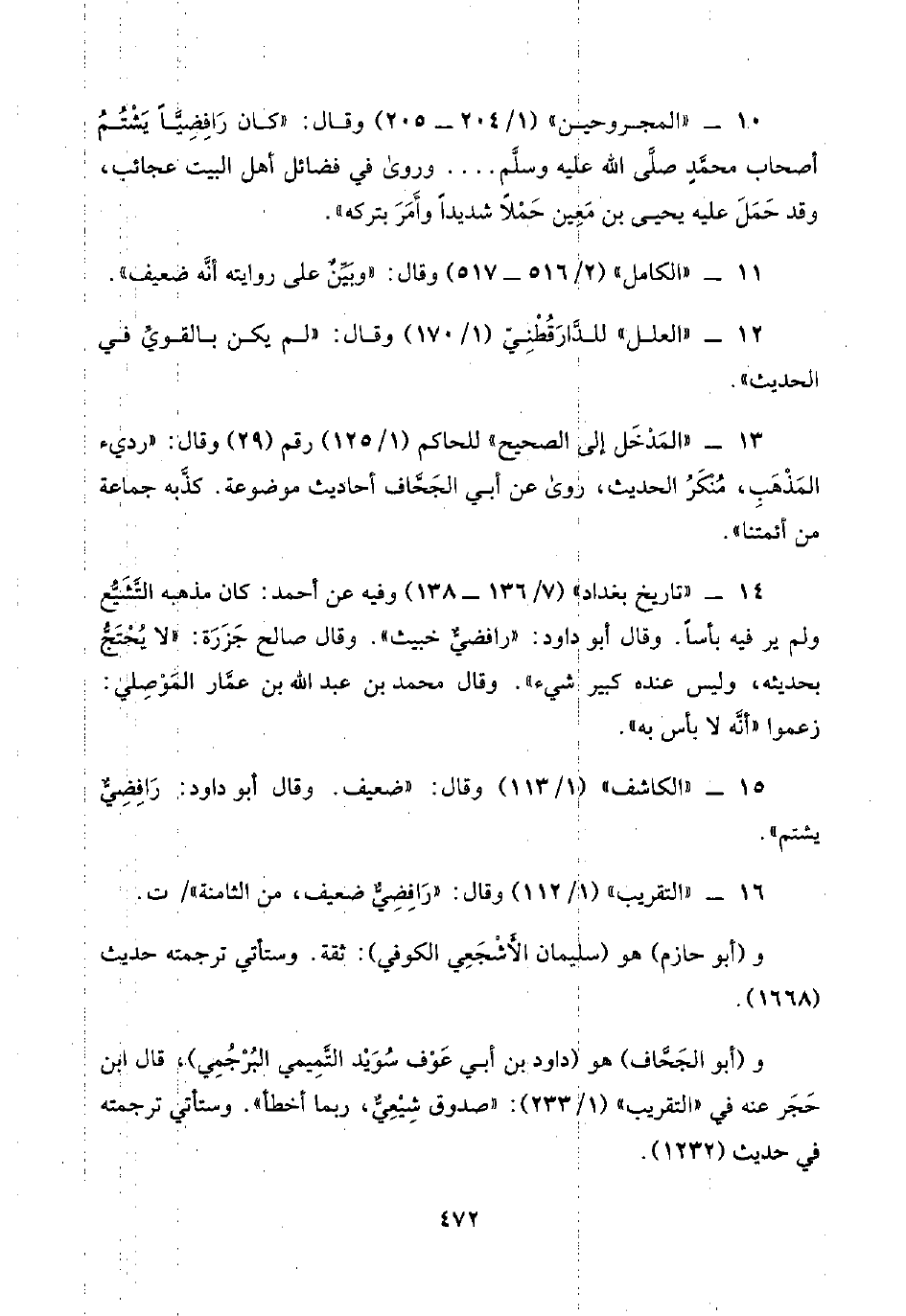 ١٠ - "المجروحين" (١/ ٢٠٤ - ٢٠٥) وقال: "كان رَافِضِيًّا يَشْتُمُ أصحاب محمَّدٍ صلَّى اللَّه عليه وسلَّم. . . . وروى في فضائل أهل البيت عجائب، وقد حَمَلَ عليه يحيى بن مَعِين حَمْلًا شديدًا وأَمَرَ بتركهـ".