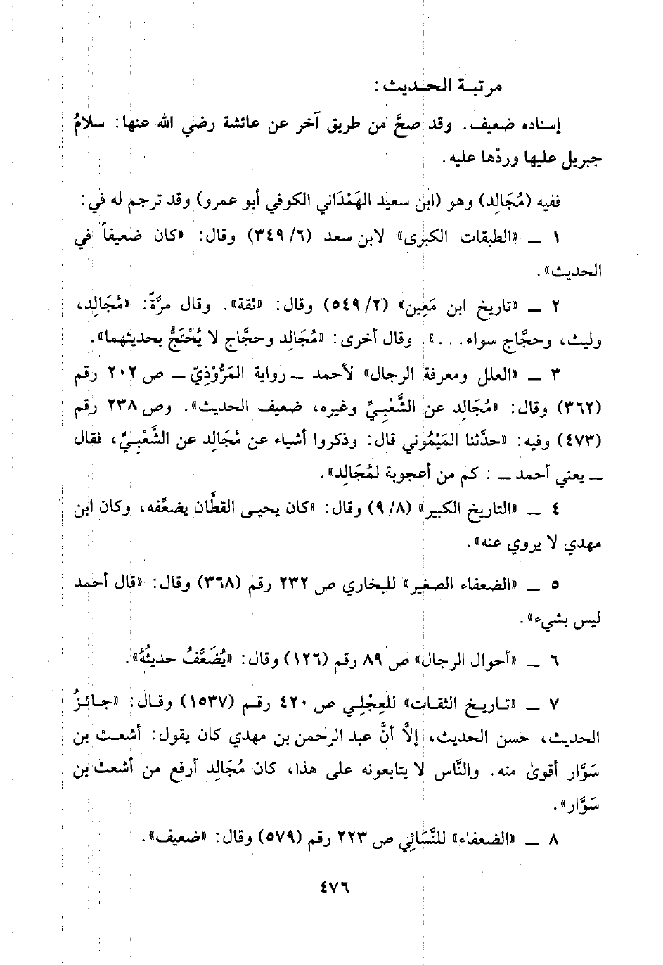 ٣ - "العلل ومعرفة الرجال" لأحمد -رواية المَرُّوْذِيّ- ص ٢٠٢ رقم (٣٦٢) وقال: "مُجَالِد عن الشَّعْبِيِّ وغيره، ضعيف الحديث". وص ٢٣٨ رقم (٤٧٣) وفيه: "حدَّثنا المَيْمُوني قال: وذكروا أشياء عن مُجَالِد عن الشَّعْبِيِّ، فقال -يعني أحمد-: كم من أعجوبة لمُجَالِد".