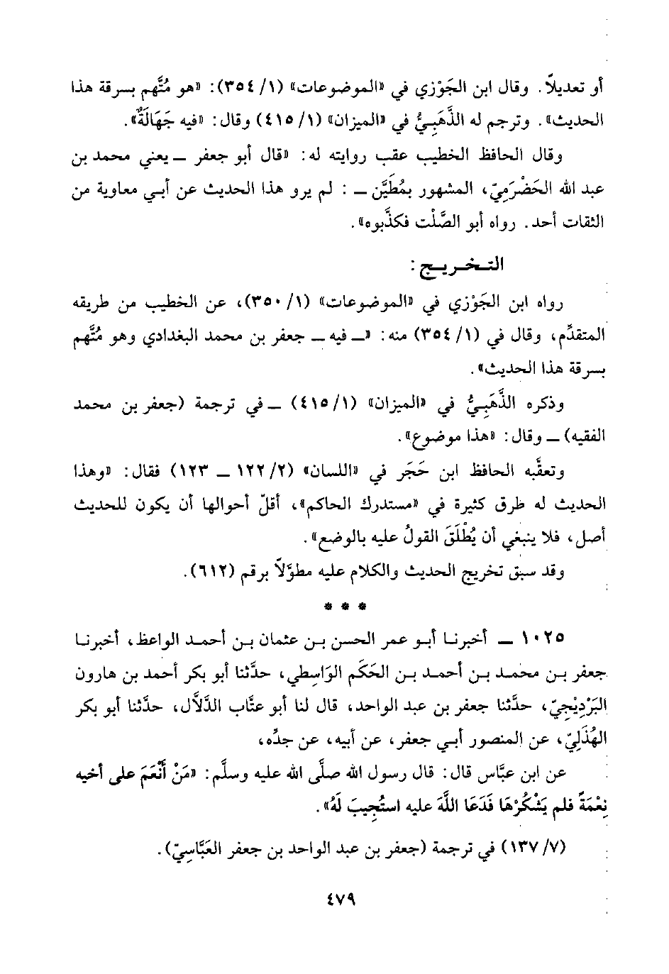 ١٠٢٥ - أخبرنا أبو عمر الحسن بن عثمان بن أحمد الواعظ، أخبرنا جعفر بن محمد بن أحمد بن الحَكَم الوَاسِطي، حدَّثنا أبو بكر أحمد بن هارون البَرْدِيْجِيّ، حدَّثنا جعفر بن عبد الواحد، قال لنا أبو عتَّاب الدَّلَّال، حدَّثنا أبو بكر الهُذَلِيّ، عن المنصور أبي جعفر، عن أبيه، عن جدِّه،