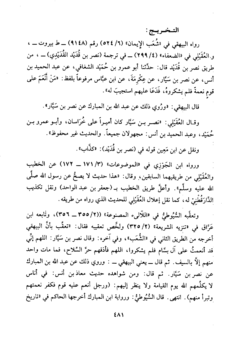 وتعقَّبه السُّيُوطيُّ في "اللآلئ المصنوعة" (٢/ ٣٥٥ - ٣٥٦)، وتابعه ابن عَرَّاق في "تنزيه الشريعة" (٢/ ٣٢٥) ولخَّص تعقيبه فقال: "تعقِّب بأنَّ البيهقي أخرجه من الطريق الثاني في "الشُّعَب"، وفي آخره: وقال نصر بن سَيَّار: اللَّهُمَّ إنِّي قد أنعمتُ على آل بسَّام فلم يشكروا، اللهم فأذقهم حرَّ السِّلاح، فما مات واحد منهم إلَّا بالسيف. ثم قال -يعني البيهقي-: وروي ذلك عن عبد اللَّه بن المبارك عن نصر بن سَيَّار. ثم قال: ومن شواهده حديث معاذ بن أنس: في أناس لا يكلِّمهم اللَّه يوم القيامة ولا ينظر إليهم: (ورجل أنعم عليه قوم فكفر نعمتهم وتبرأ منهم). انتهى. قال السُّيُوطِيُّ: ورواية ابن المبارك أخرجها الحاكم في "تاريخ