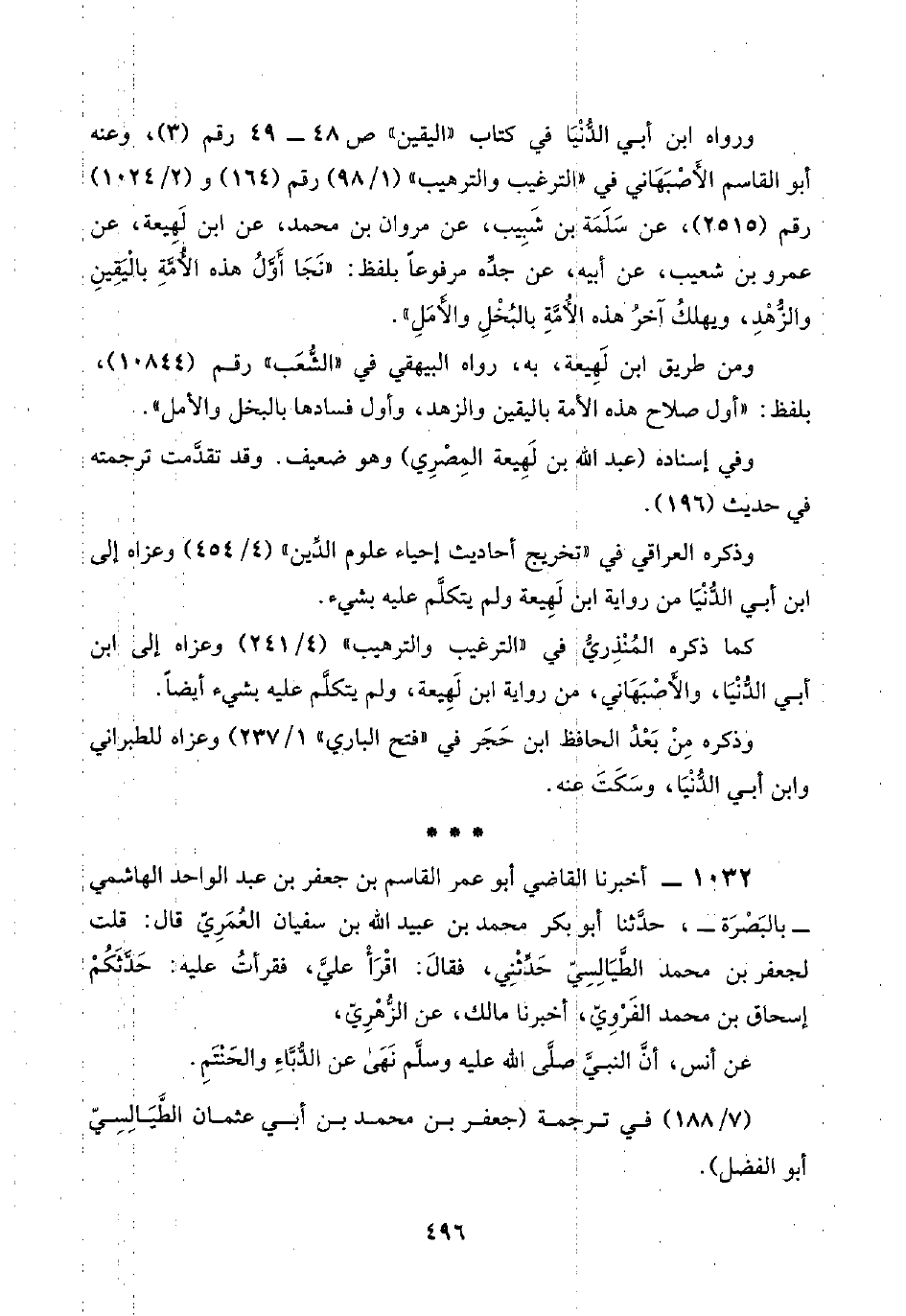 ١٠٣٢ - أخبرنا القاضي أبو عمر القاسم بن جعفر بن عبد الواحد الهاشمي -بالبَصْرَة-، حدَّثنا أبو بكر محمد بن عبيد اللَّه بن سفيان العُمَرِيّ قال: قلت لجعفر بن محمد الطَّيَالِسِيّ حَدَّثْنِي، فقال: اقْرَأْ عليَّ، فقرأتُ عليه: حَدَّثَكُمْ إسحاق بن محمد الفَرْوِيّ، أخبرنا مالك، عن الزُّهْرِيّ،
