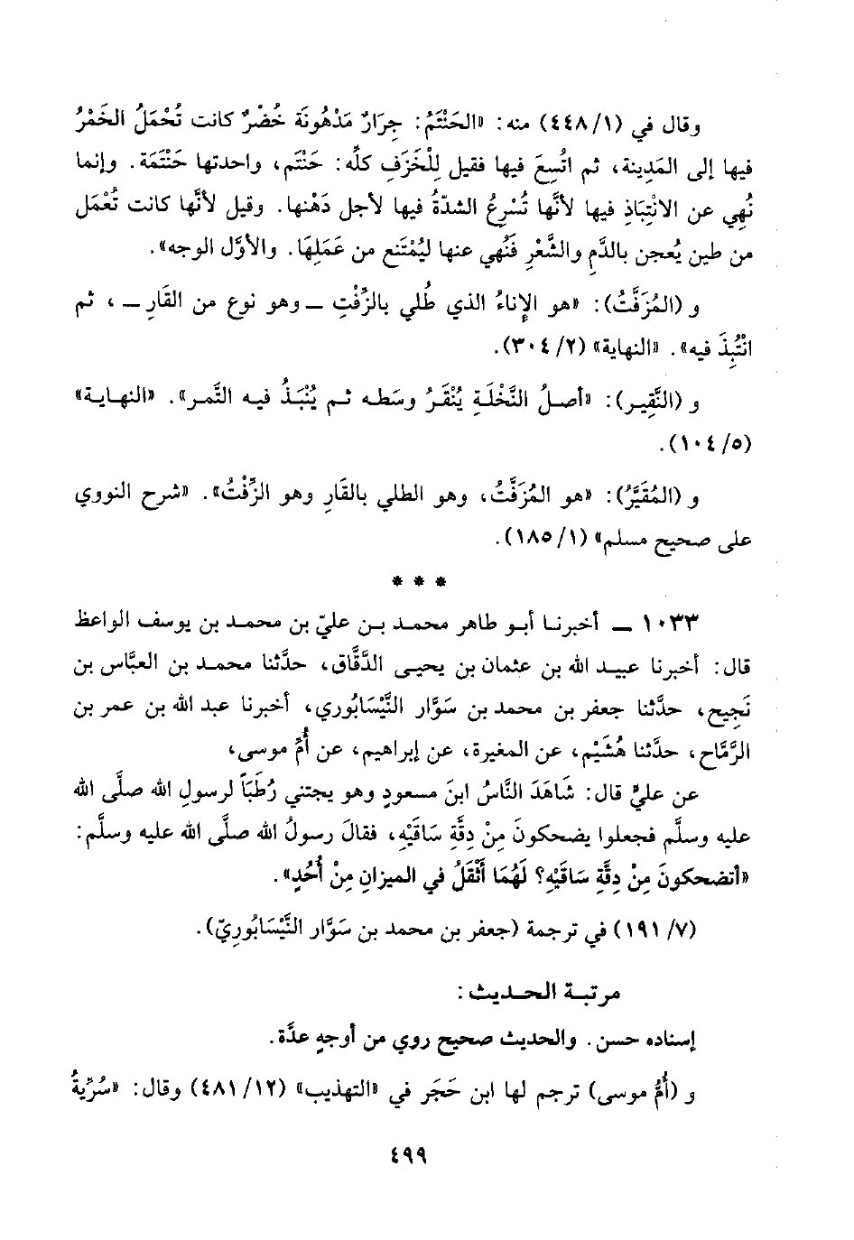 ١٠٣٣ - أخبرنا أبو طاهر محمد بن عليّ بن محمد بن يوسف الواعظ قال: أخبرنا عبيد اللَّه بن عثمان بن يحيى الدَّقَّاق، حدَّثنا محمد بن العبَّاس بن نَجِيح، حدَّثنا جعفر بن محمد بن سَوَّار النَّيْسَابُوري، أخبرنا عبد اللَّه بن عمر بن الرَّمَّاح، حدَّثنا هُشَيْم، عن المغيرة، عن إبراهيم، عن أُمِّ موسى،