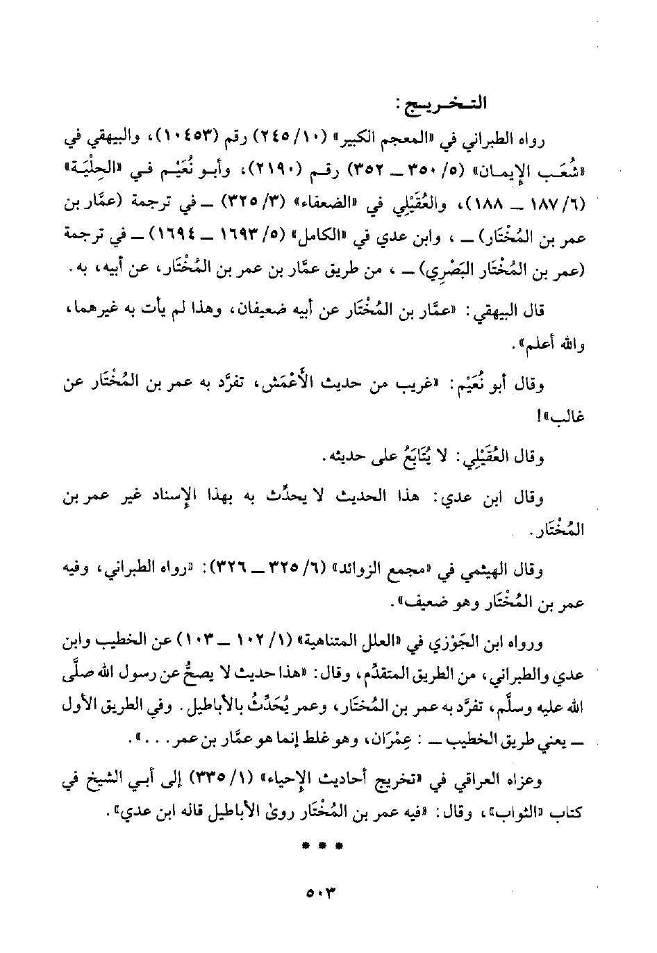 رواه الطبراني في "المعجم الكبير" (١٠/ ٢٤٥) رقم (١٠٤٥٣)، والبيهقي في "شُعَب الإِيمان" (٥/ ٣٥٠ - ٣٥٢) رقم (٢١٩٠)، وأبو نُعَيْم في "الحِلْيَة" (٦/ ١٨٧ - ١٨٨)، والعُقَيْلي في "الضعفاء" (٣/ ٣٢٥) -في ترجمة (عمَّار بن عمر بن المُخْتَار) -، وابن عدي في "الكامل" (٥/ ١٦٩٣ - ١٦٩٤) -في ترجمة عمر بن المُخْتَار البَصْرِي) -، من طريق عمَّار بن عمر بن المُخْتَار، عن أبيه، به.