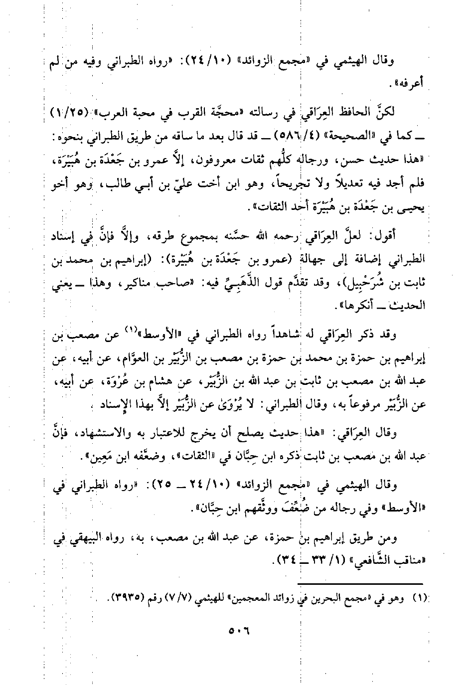 وقال العِرَاقي: "هذا حديث يصلح أن يخرج للاعتبار به والاستشهاد، فإنَّ عبد اللَّه بن مصعب بن ثابت ذكره ابن حِبَّان في "الثقات"، وضعَّفه ابن مَعِين".