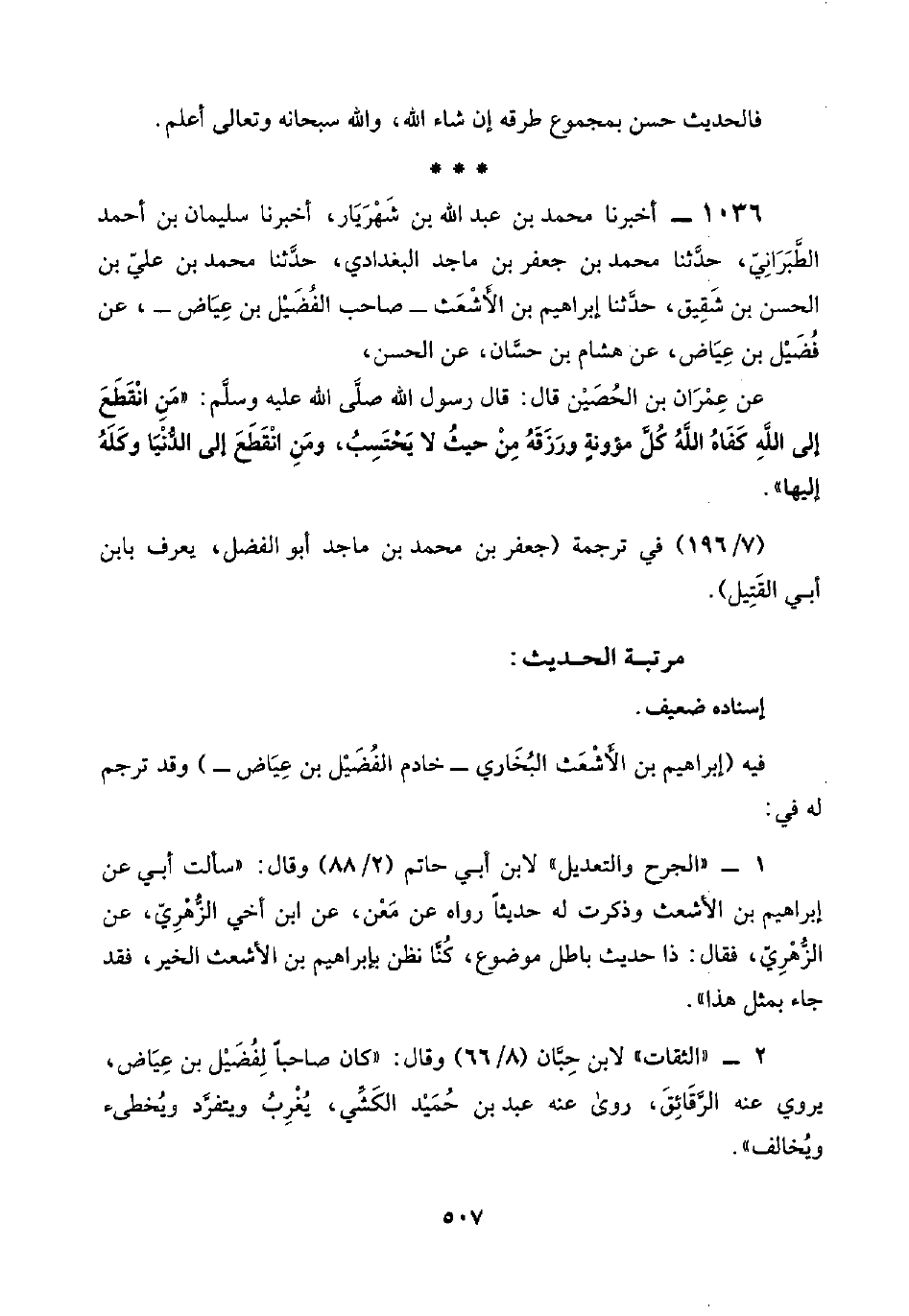 ١٠٣٦ - أخبرنا محمد بن عبد اللَّه بن شَهْرَيَار، أخبرنا سليمان بن أحمد الطَّبَرَانِيّ، حدَّثنا محمد بن جعفر بن ماجد البغدادي، حدَّثنا محمد بن عليّ بن الحسن بن شقيق، حدَّثنا إبراهيم بن الأَشْعَث -صاحب الفُضَيْل بن عِيَاض-، عن فُضَيْل بن عِيَاض، عن هشام بن حسَّان، عن الحسن،