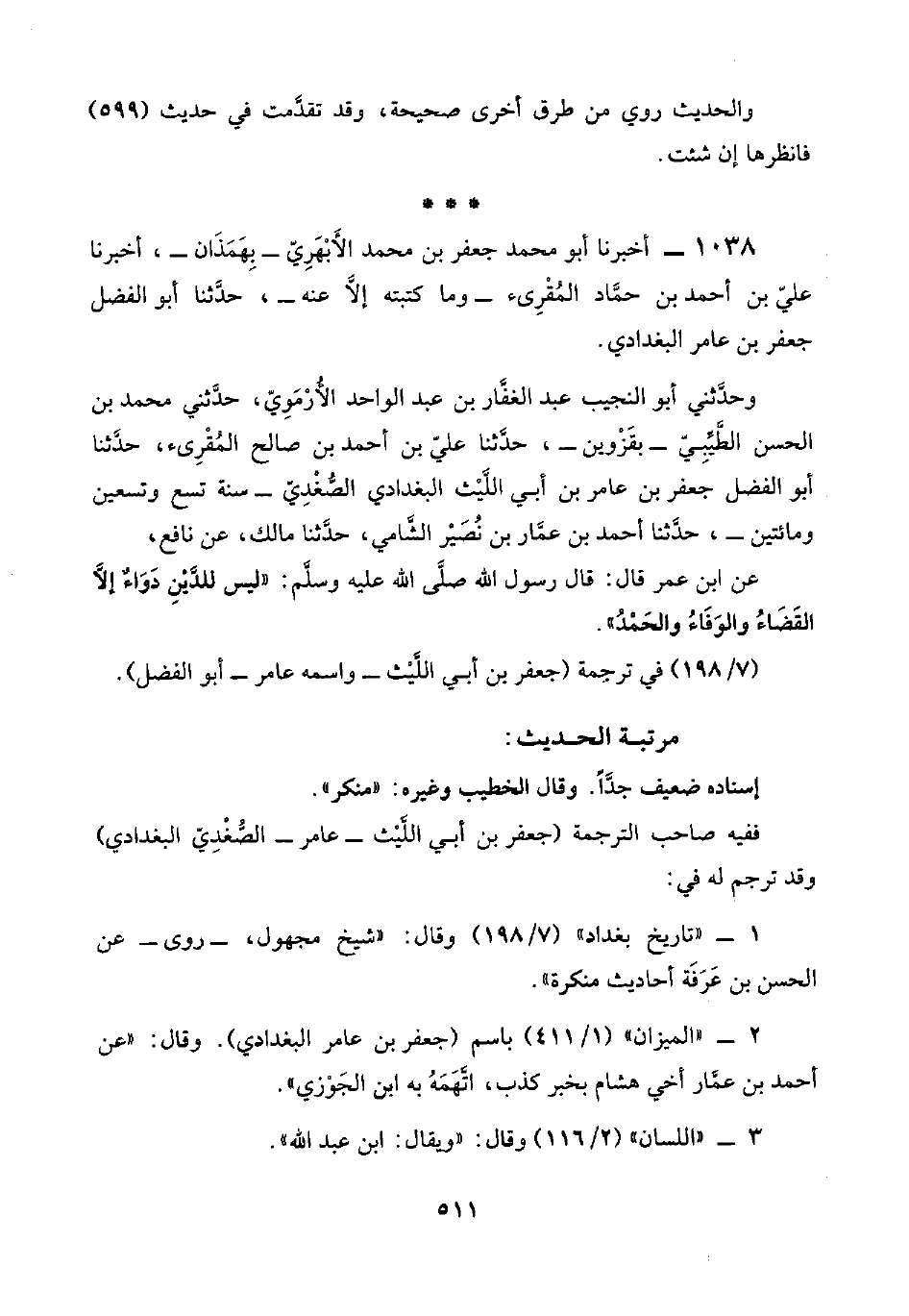 ١٠٣٨ - أخبرنا أبو محمد جعفر بن محمد الأَبْهَرِيّ -بِهَمَذَان-، أخبرنا عليّ بن أحمد بن حمَّاد المُقْرِئ -وما كتبته إلَّا عنه-، حدَّثنا أبو الفضل جعفر بن عامر البغدادي.