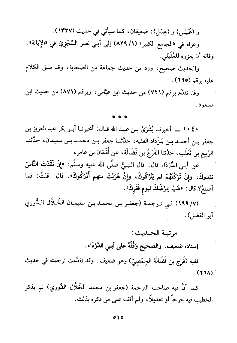 ١٠٤٠ - أخبرنا بُشْرَى بن عبد اللَّه قال: أخبرنا أبو بكر عبد العزيز بن جعفر بن أحمد بن يَزْدَاد الفقيه، حدَّثنا جعفر بن محمد بن سليمان، حدَّثنا الرَّبيع بن ثَعْلَب، حدَّثنا الفرَجُ بن فَضَالة، عن لُقْمَان بن عامر،