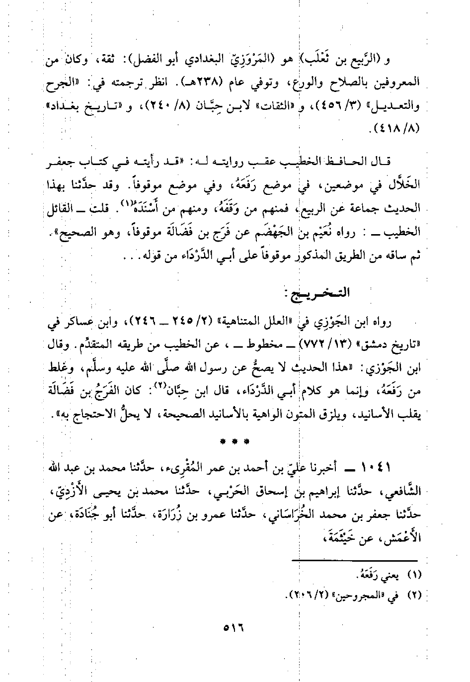 قال الحافظ الخطيب عقب روايته له: قد رأيته في كتاب جعفر الخَلَّال في موضعين، في موضع رَفَعَهُ، وفي موضع موقوفًا. وقد حدَّثنا بهذا الحديث جماعة عن الربيع، فمنهم من وَقَفَهُ، ومنهم من أَسْنَدَهُ (¬١). قلت -القائل الخطيب-: رواه نُعَيْم بن الجَهْضَمْ عن فَرَج بن فَضَالة موقوفًا، وهو الصحيح". ثم ساقه من الطريق المذكور موقوفًا على أبي الدَّرْدَاء من قوله. . .