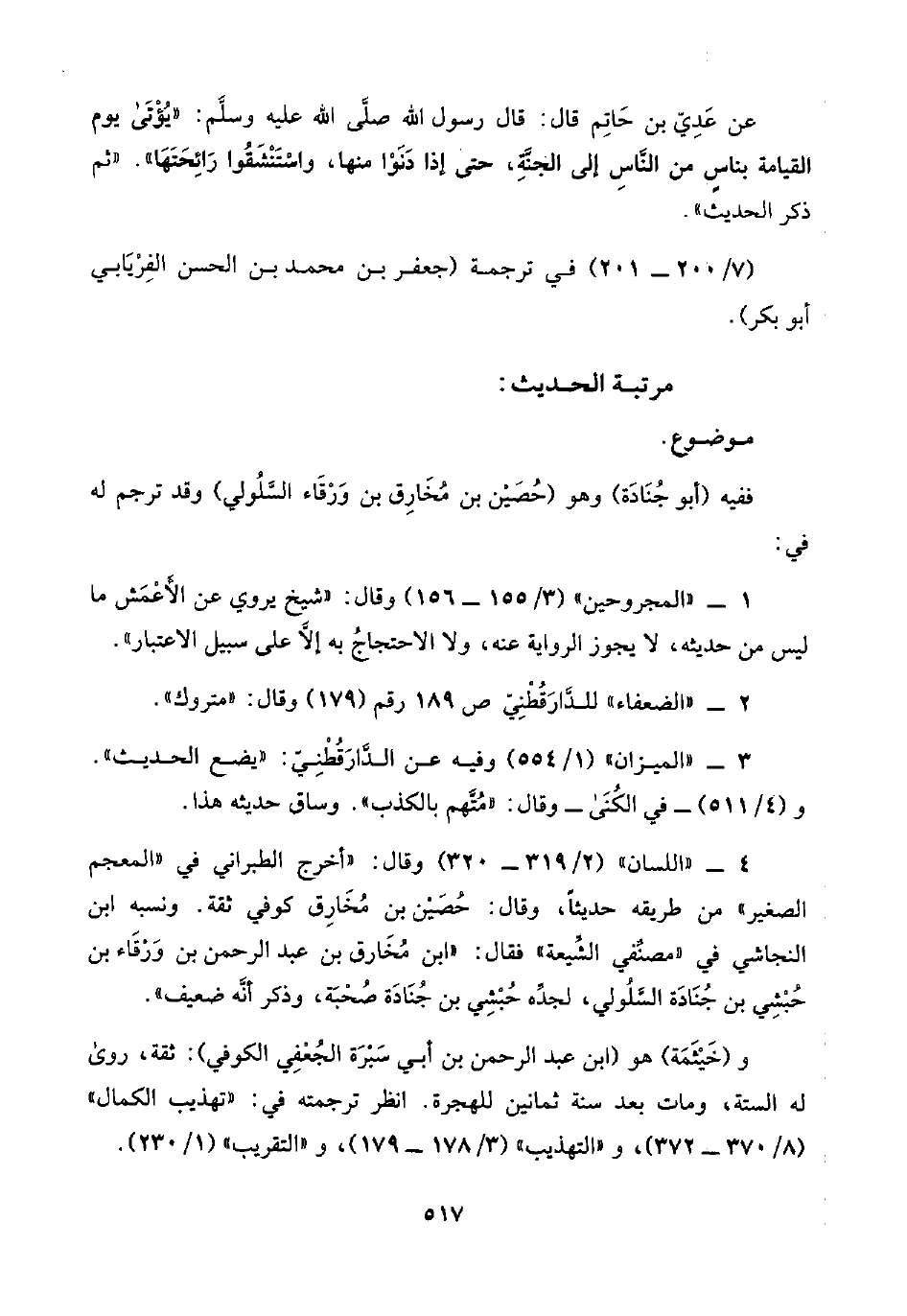 ٤ - "اللسان" (٢/ ٣١٩ - ٣٢٠) وقال: "أخرج الطبراني في "المعجم الصغير" من طريقه حديثًا، وقال: حُصَيْن بن مُخَارِق كوفي ثقة. ونسبه ابن النجاشي في مصنِّفي الشِّيعة، فقال: "ابن مُخَارق بن عبد الرحمن بن وَرْقَاء بن حُبْشِي بن جُنَادَة السَّلُولي، لجدِّه حُبْشِي بن جُنَادَة صُحْبَة، وذكر أنَّه ضعيف".