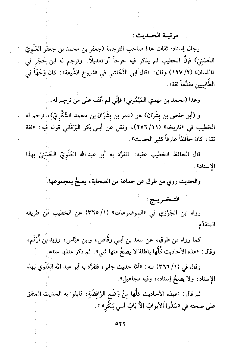 رجال إسناده ثقات غدا صاحب الترجمة (جعفر بن محمد بن جعفر العَلَوِيّ الحَسَنِيّ) فإنَّ الخطيب لم يذكر فيه جرحًا أو تعديلًا. وترجم له ابن حَجَر في "اللسان" (٢/ ١٢٧) وقال: "قال ابن النَّجَاشي في "شيوخ الشِّيعة": كان وَجْهًا في الطَّالِبين مقدَّمًا ثقة".