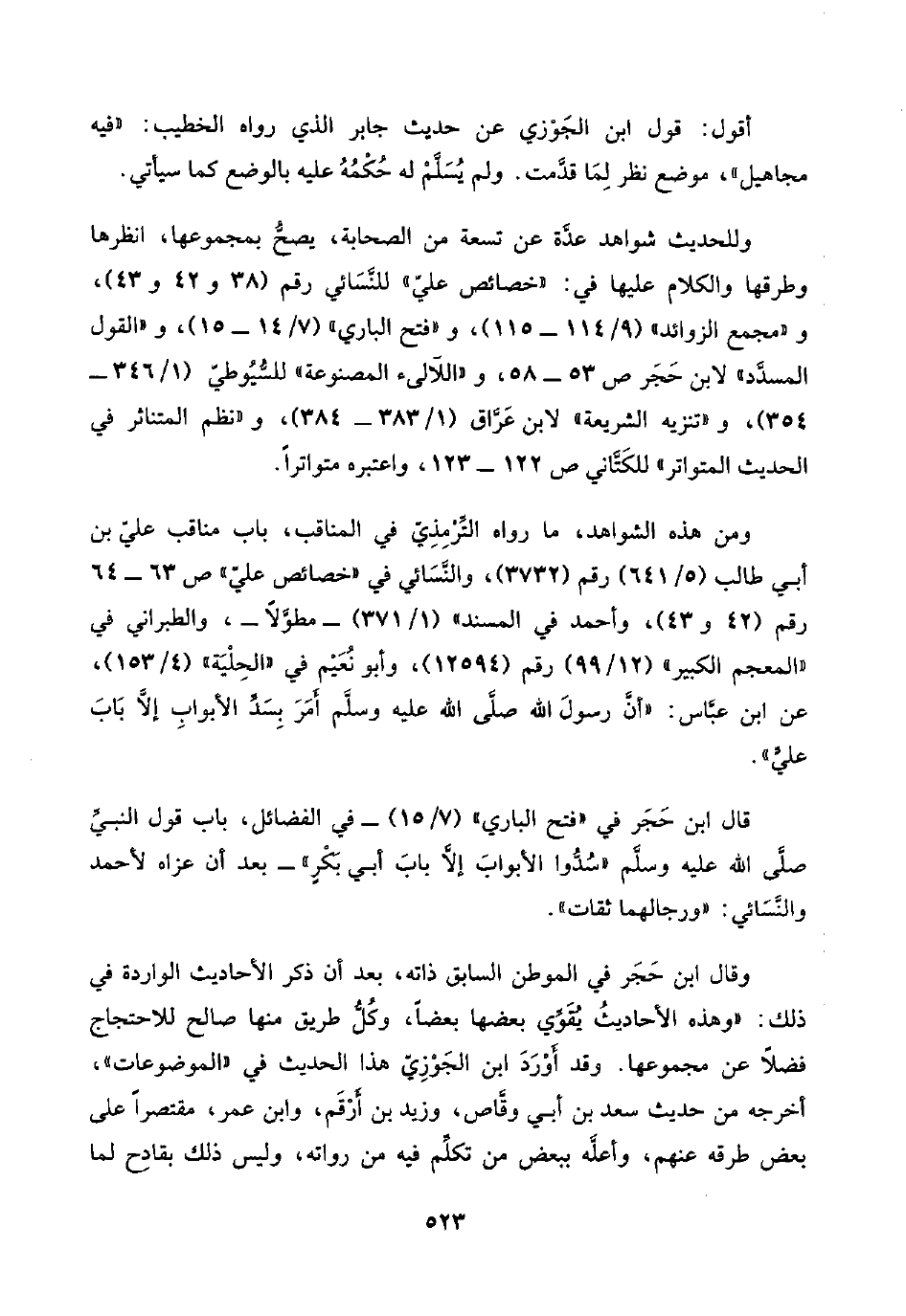 ومن هذه الشواهد، ما رواه التِّرْمِذِيّ في المناقب، باب مناقب عليّ بن أبي طالب (٥/ ٦٤١) رقم (٣٧٣٢)، والنَّسَائي في "خصائص عليّ" ص ٦٣ - ٦٤ رقم (٤٢ و ٤٣)، وأحمد في "المسند" (١/ ٣٧١) -مطوَّلًا-، والطبراني في "المعجم الكبير" (١٢/ ٩٩) رقم (١٢٥٩٤)، وأبو نُعَيْم في "الحِلْيَة" (٤/ ١٥٣)، عن ابن عبَّاس: "أنَّ رسول اللَّه صلَّى اللَّه عليه وسلَّم أمَرَ بِسَدِّ الأبواب إلَّا بَابَ عليٍّ".
