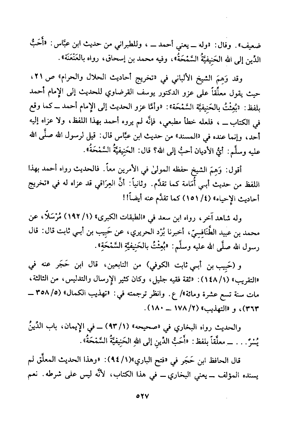 وقد وَهِمَ الشيخ الألباني في "تخريج أحاديث الحلال والحرام" ص ٢١، حيث يقول معلِّقًا على عزو الدكتور يوسف القرضاوي للحديث إلى الإِمام أحمد بلفظ: "بُعِثْتُ بالحَنِيفِيَّةِ السَّمْحَةِ": "وأمَّا عزو الحديث إلى الإِمام أحمد -كما وقع في الكتاب-، فلعله خطأ مطبعي، فإنَّه لم يروه أحمد بهذا اللفظ، ولا عزاه إليه أحد، وإنما عنده في "المسند" من حديث ابن عبَّاس قال: قيل لرسول اللَّه صلَّى اللَّه عليه وسلَّم: أيُّ الأديان أحبُّ إلى اللَّه؟ قال: الحَنِيفِيَّةِ السَّمْحَةِ".