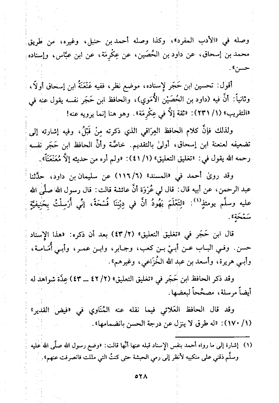 ولذلك فإنَّ كلام الحافظ العِرَاقي الذي ذكرته مِنْ قَبْلُ، وفيه إشارته إلى تضعيفه لعنعنة ابن إسحاق، أولى بالتقديم. خاصَّة وأنَّ الحافظ ابن حَجَر نفسه رحمه اللَّه يقول في: "تغليق التعليق" (١/ ٤١): "ولم أره من حديثه إلَّا مُعَنْعَنًا".