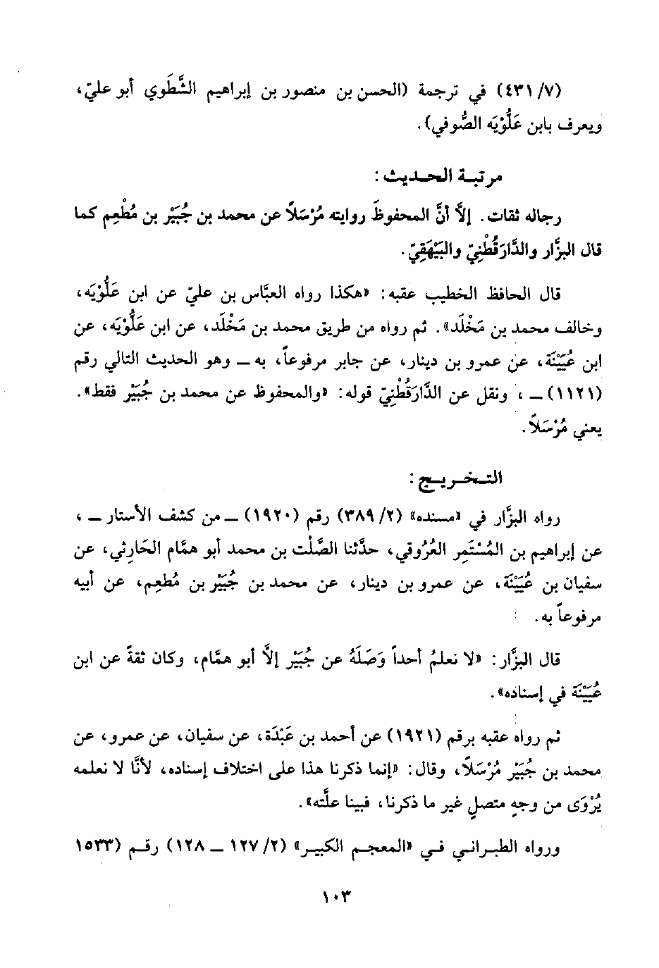 رجاله ثقات. إلَّا أنَّ المحفوظَ روايته مُرْسَلًا عن محمد بن جُبَيْر بن مُطْعِم كما قال البزَّار والدَّارَقُطْنِيّ والبَيْهَقِيّ.