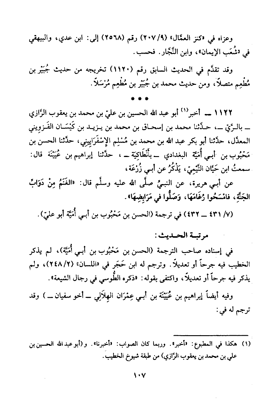 ١١٢٢ - أخبر (¬١) أبو عبد اللَّه الحسين بن عليّ بن محمد بن يعقوب الرَّازي -بالرَّيّ-، حدَّثنا محمد بن إسحاق بن محمد بن يزيد بن كَيْسَان القَزوِيني المعدَّل، حدَّثنا أبو بكر عبد اللَّه بن محمد بن مُسْلِم الإِسْفَرَايِينِي، حدَّثنا الحسن بن مَحْبُوب بن أبي أُمَيَّة البغدادي -بأَنْطاَكِيَة-، حدَّثنا إبراهيم بن عُيَيْنَة قال: سمعتُ ابن حَيَّان التَّيْمِيّ، يَذْكُرُ عن أبي زُرْعَة،