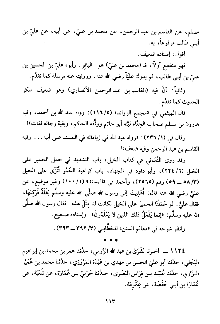 وقد روى النَّسَائي في كتاب الخيل، باب التشديد في حمل الحمير على الخيل (٦/ ٢٢٤)، وأبو داود في الجهاد، باب كراهية الحُمُر تُنْزَى على الخيل (٣/ ٥٨ - ٥٩) رقم (٢٥٦٥)، وأحمد في "المسند" (١/ ١٠٠) وغير موضع، عن عليٍّ رضي اللَّه عنه قال: أُهْدِيَتْ إلى رسول اللَّه صلَّى اللَّه عليه وسلَّم بَغْلَةٌ فَرَكِبَهَا، فقال عليٌّ: لو حَمَلْنَا الحميرَ على الخيل لكانت لنا مِثْلَ هذه. فقال رسول اللَّه صلَّى اللَّه عليه وسلَّم: "إنما يَفْعَلُ ذلك الذين لا يَعْلَمُونَ". وإسناده صحيح.