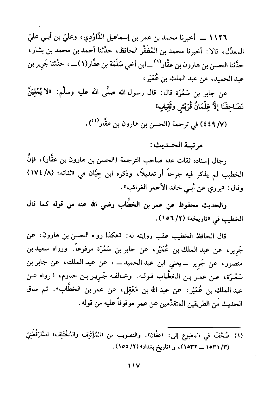 ١١٢٦ - أخبرنا محمد بن عمر بن إسماعيل الدَّاوُدِي، وعليّ بن أبي عليّ المعدَّل، قالا: أخبرنا محمد بن المُظَفَّر الحافظ، حدَّثنا أحمد بن محمد بن بشار، حدَّثنا الحسن بن هارون بن عقَّار (¬١) -ابن أخي سَلَمَة بن عقَّار (١) -، حدَّثنا جَرِير بن عبد الحميد، عن عبد الملك بن عُمَيْر،