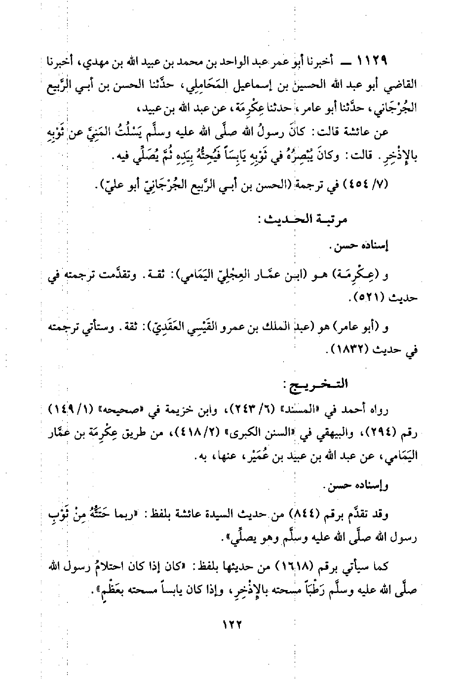 كما سيأتي برقم (١٦١٨) من حديثها بلفظ: "كان إذا كان احتلامُ رسول اللَّه صلي اللَّه عليه وسلَّم رَطْبًا مسحته بالإِذْخِرِ، وإذا كان يابسًا مسحته بعَظْمٍ".