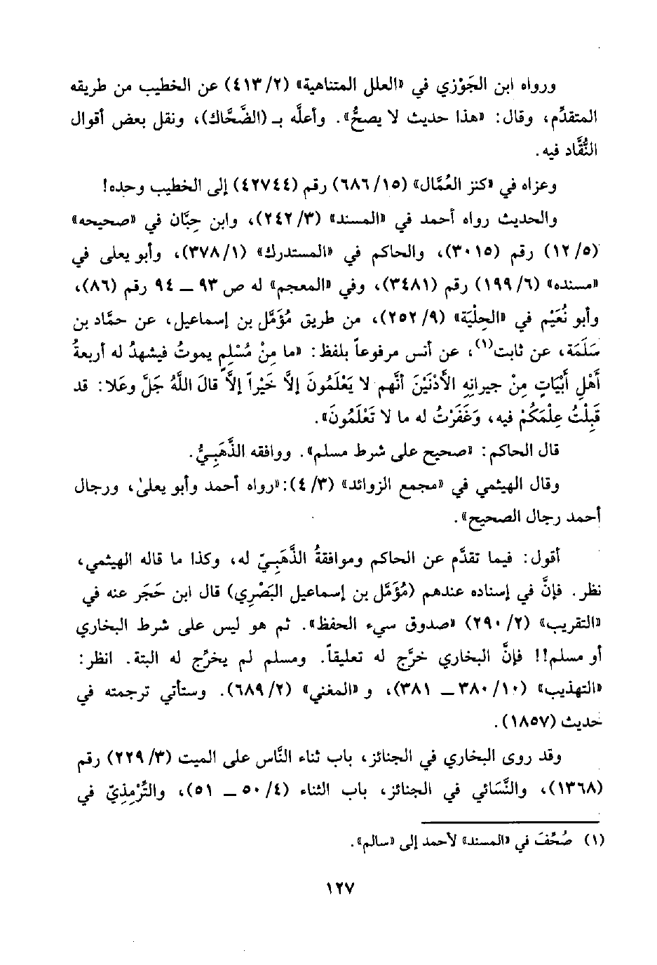 أقول: فيما تقدَّم عن الحاكم وموافقةُ الذَّهَبِيّ له، وكذا ما قاله الهيثمي، نظر. فإنَّ في إسناده عندهم (مُؤَمَّل بن إسماعيل البَصْري) قال ابن حَجَر عنه في "التقريب" (٢/ ٢٩٠) "صدوق سيء الحفظ". ثم هو ليس على شرط البُخَاري أو مسلم! ! فإنَّ البُخَاري خرَّج له تعليقًا. ومسلم لم يخرِّج له البتة. انظر: "التهذيب" (١٠/ ٣٨٠ - ٣٨١)، و"المغني" (٢/ ٦٨٩). وستأتي ترجمته في حديث (١٨٥٧).