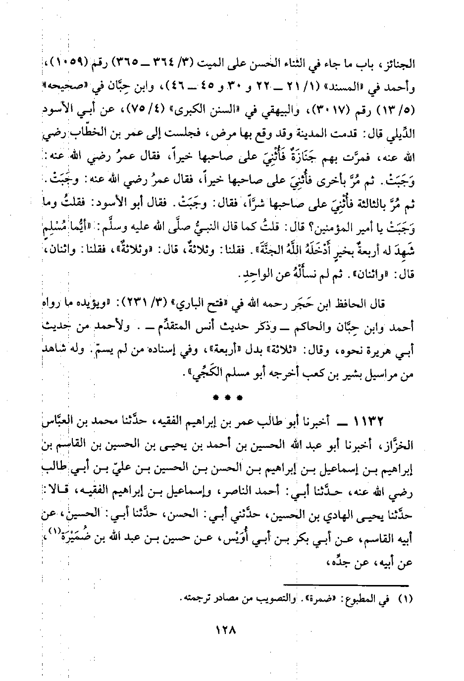 ١١٣٢ - أخبرنا أبو طالب عمر بن إبراهيم الفقيه، حدَّثنا محمد بن العبَّاس الخزَّاز، أخبرنا أبو عبد اللَّه الحسين بن أحمد بن يحيى بن الحسين بن القاسم بن إبراهيم بن إسماعيل بن إبراهيم بن الحسن بن الحسين بن عليّ بن أبي طالب رضي اللَّه عنه، حدَّثنا أبي: أحمد الناصر، وإسماعيل بن إبراهيم الفقيه، قالا: حدَّثنا يحيى الهادي بن الحسين، حدَّثني أبي: الحسن، حدَّثنا أبي: الحسين، عن أبيه القاسم، عن أبي بكر بن أبي أُوَيْس، عن حسين بن عبد اللَّه بن ضُمَيْرَة (¬١)، عن أبيه، عن جَدِّه،