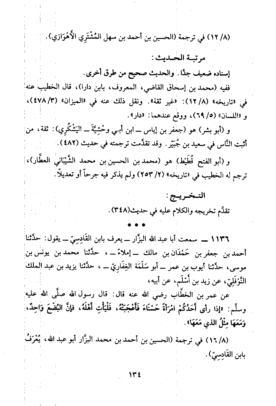 ١١٣٦ - سمعت أبا عبد اللَّه البزَّار -يعرف بابن القَادِسِيّ- يقول: حدَّثنا أحمد بن جعفر بن حَمْدَان بن مالك -إملاءً-، حدَّثنا محمد بن يونس بن موسى، حدَّثنا أيوب بن عمر -أبو سَلَمَة الغِفَارِيّ-، حدَّثنا يزيد بن عبد الملك النَّوْفَلِيّ، عن زيد بن أَسْلَم، عن أبيه،