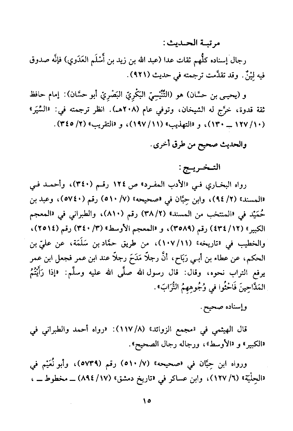 رواه البُخَاري في "الأدب المفرد" ص ١٢٤ رقم (٣٤٠)، وأحمد في "المسند" (٢/ ٩٤)، وابن حِبَّان في "صحيحه" (٧/ ٥١٠) رقم (٥٧٤٠)، وعبد بن حُمَيْد في "المنتخب من "المسند" (٢/ ٣٨) رقم (٨١٠)، والطبراني في "المعجم الكبير" (١٢/ ٤٣٤) رقم (٣٥٨٩)، و"المعجم الأوسط" (٣/ ٣٤٠) رقم (٢٥١٤)، والخطيب في "تاريخه" (١١/ ١٠٧)، من طريق حمَّاد بن سَلَمَة، عن عليّ بن الحكم، عن عطاء بن أبي رَبَاح، أنَّ رجلًا مَدَحَ رجلًا عند ابن عمر فجعل ابن عمر يرفع التراب نحوه، وقال: قال رسول اللَّه صلَّى اللَّه عليه وسلَّم: "إذا رَأَيْتُمُ المَدَّاحِينَ فَاحْثُوا في وُجُوهِهِمُ التُّرَابَ".