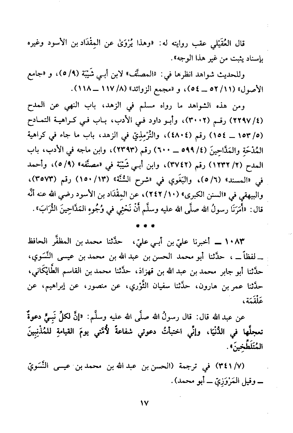 ومن هذه الشواهد ما رواه مسلم في الزهد، باب النهي عن المدح (٤/ ٢٢٩٧) رقم (٣٠٠٢)، وأبو داود في الأدب، باب في كراهية التمادح (٥/ ١٥٣ - ١٥٤) رقم (٤٨٠٤)، والتِّرْمِذِيّ في الزهد، باب ما جاء في كراهية المُدْحَةِ والمَدَّاحِينَ (٤/ ٥٩٩ - ٦٠٠) رقم (٢٣٩٣)، وابن ماجه في الأدب، باب المدح (٢/ ١٢٣٢) رقم (٣٧٤٢)، وابن أبي شَيْبَة في "مصنَّفه" (٩/ ٥)، وأحمد في "المسند" (٦/ ٥)، والبَغَوي في "شرح السُّنَّة" (١٣/ ١٥٠) رقم (٣٥٧٣)، والبيهقي في "السنن الكبرى" (١٠/ ٢٤٢)، عن المِقْدَاد بن الأسود رضي اللَّه عنه أنَّه قال: "أَمَرَنَا رسولُ اللَّه صلَّى اللَّه عليه وسلَّم أَنْ نَحْثِي في وُجُوهِ المَدَّاحِينَ التُّرَابَ".