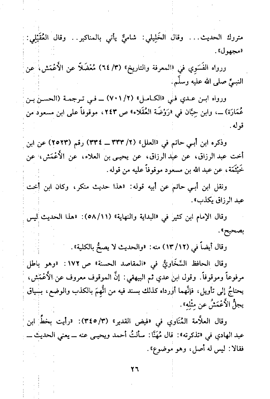 وقال الحافظ السَّخَاويُّ في "المقاصد الحسنة" ص ١٧٢: "وهو باطل مرفوعًا وموقوفًا. وقول ابن عدي ثم البيهقي: إنَّ الموقوف معروف عن الأَعْمَش، يحتاجُ إلى تأويل، فإنَّهما أورداه كذلك بسند فيه من اتُّهِمَ بالكذب والوضع، بسياق يجلُّ الأَعْمَشُ عن مِثْلِهِ".