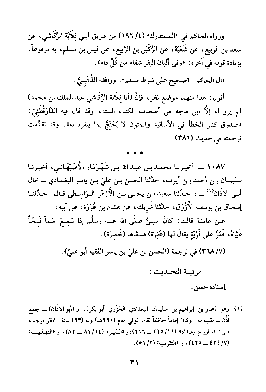 (¬١) وهو (عمر بن إبراهيم بن سليمان البغدادي الجَزَري أبو بكر). و (أبو الآذَان) -جمع أُذُن- لقب له. وكان إمامًا حافظًا ثقة، توفي عام (٢٩٠ هـ) وله (٦٣) سنة. انظر ترجمته في: "تاريخ بغداد" (١١/ ٢١٥ - ٢١٦)، و"السِّيَر" (١٤/ ٨١ - ٨٢)، و"التهذيب" (٧/ ٤٢٤ - ٤٢٥)، و"التقريب" (٢/ ٥١).