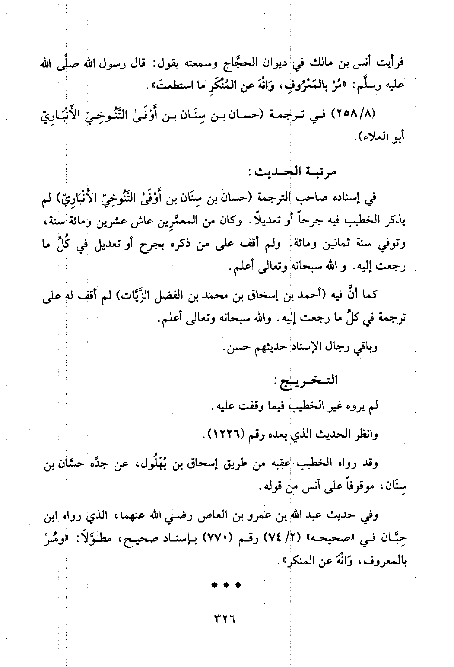 في إسناده صاحب الترجمة (حسان بن سِنَان بن أَوْفَي التَّنُوخِيّ الأَنْبَارِيّ) لم يذكر الخطيب فيه جرحًا أو تعديلًا. وكان من المُعْمَّرِين عاش عشرين ومائة سنة، وتوفي سنة ثمانين ومائة. ولم أقف على من ذكره بجرح أو تعديل في كُلِّ ما رجعت إليه. واللَّه سبحانه وتعالى أعلم.