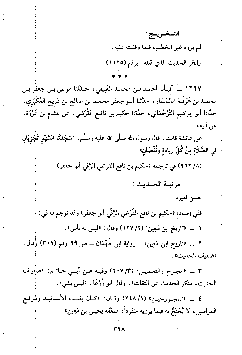 ١٢٢٧ - أنبأنا أحمد بن محمد العَتِيقي، حدَّثنا موسى بن جعفر بن محمد بن عَرَفَة السِّمْسَار، حدَّثنا أبو جعفر محمد بن صالح بن ذَرِيح العُكْبَرِي، حدَّثنا أبو إبراهيم التَّرْجُمَانِي، حدَّثنا حكيم بن نافع القُرَشي، عن هشام بن عُرْوَة، عن أبيه،
