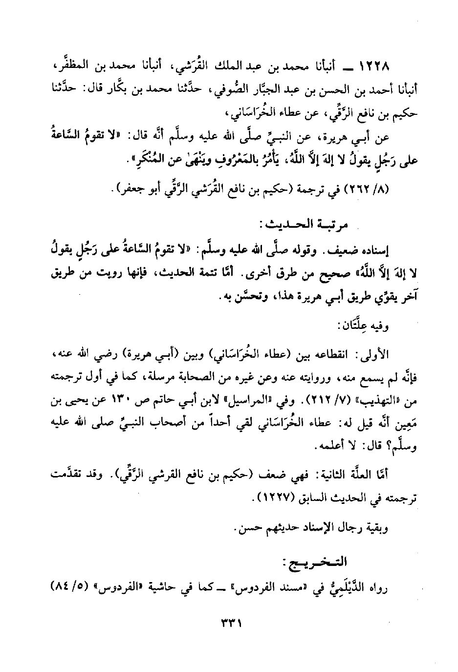 ١٢٢٨ - أنبأنا محمد بن عبد الملك القُرَشِي، أنبأنا محمد بن المُظَفَّر، أنبأنا أحمد بن الحسن بن عبد الجبَّار الصُّوفي، حدَّثنا محمد بن بكَّار قال: حدَّثنا حكيم بن نافع الرَّقِّي، عن عطاء الخُرَاسَانِي،