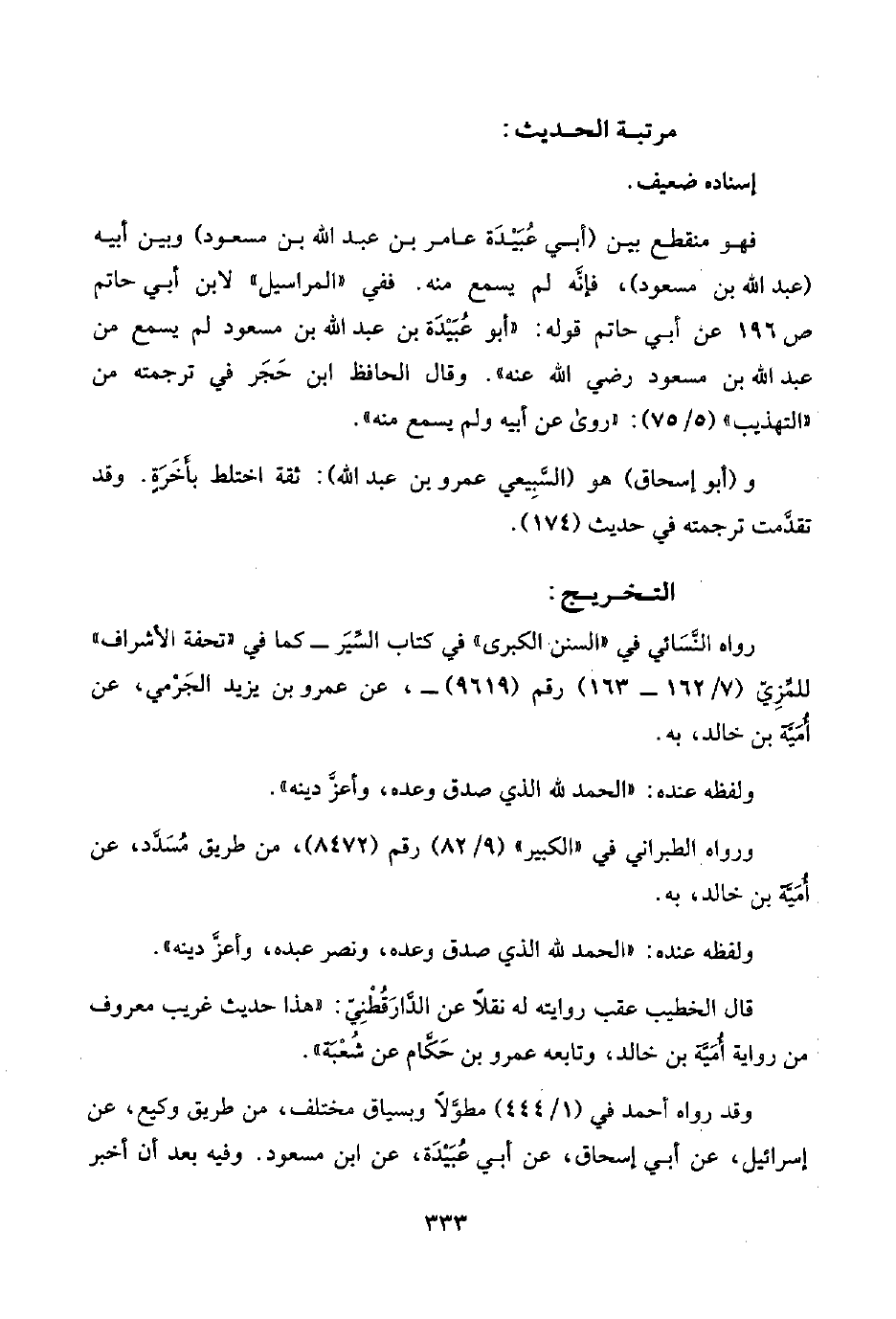 فهو منقطع بين (أبي عُبَيْدَة عامر بن عبد اللَّه بن مسعود) وبين أبيه (عبد اللَّه بن مسعود)، فإنَّه لم يسمع منه. ففي "المراسيل" لابن أبي حاتم ص ١٩٦ عن أبي حاتم قوله: "أبو عُبَيْدَة بن عبد اللَّه بن مسعود لم يسمع من عبد اللَّه بن مسعود رضي اللَّه عنه". وقال الحافظ ابن حَجَر في ترجمته من "التهذيب" (٥/ ٧٥): "روى عن أبيه ولم يسمع منه".