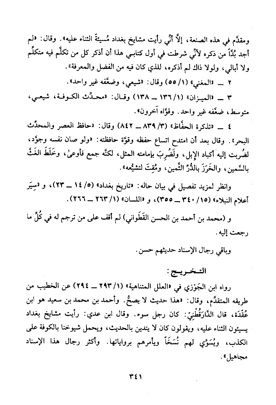 ٤ - "تذكرة الحفَّاظ" (٣/ ٨٣٩ - ٨٤٢) وقال: "حافظ العصر والمحدِّث البحر". وقال بعد أن امتدح اتساع حفظه وقوَّة حافظته: "ولو صان نفسه وجوَّد، لضُربت إليه أكباد الإِبل، ولَضُرِبَ بإمامته المثل، لكنَّه جمع فأوعى، وخَلَطَ الغَثَّ بالسَّمين، والخَرَزَ بالدُّرِّ الثَّمين، ومُقِتَ لتشيُّعه".