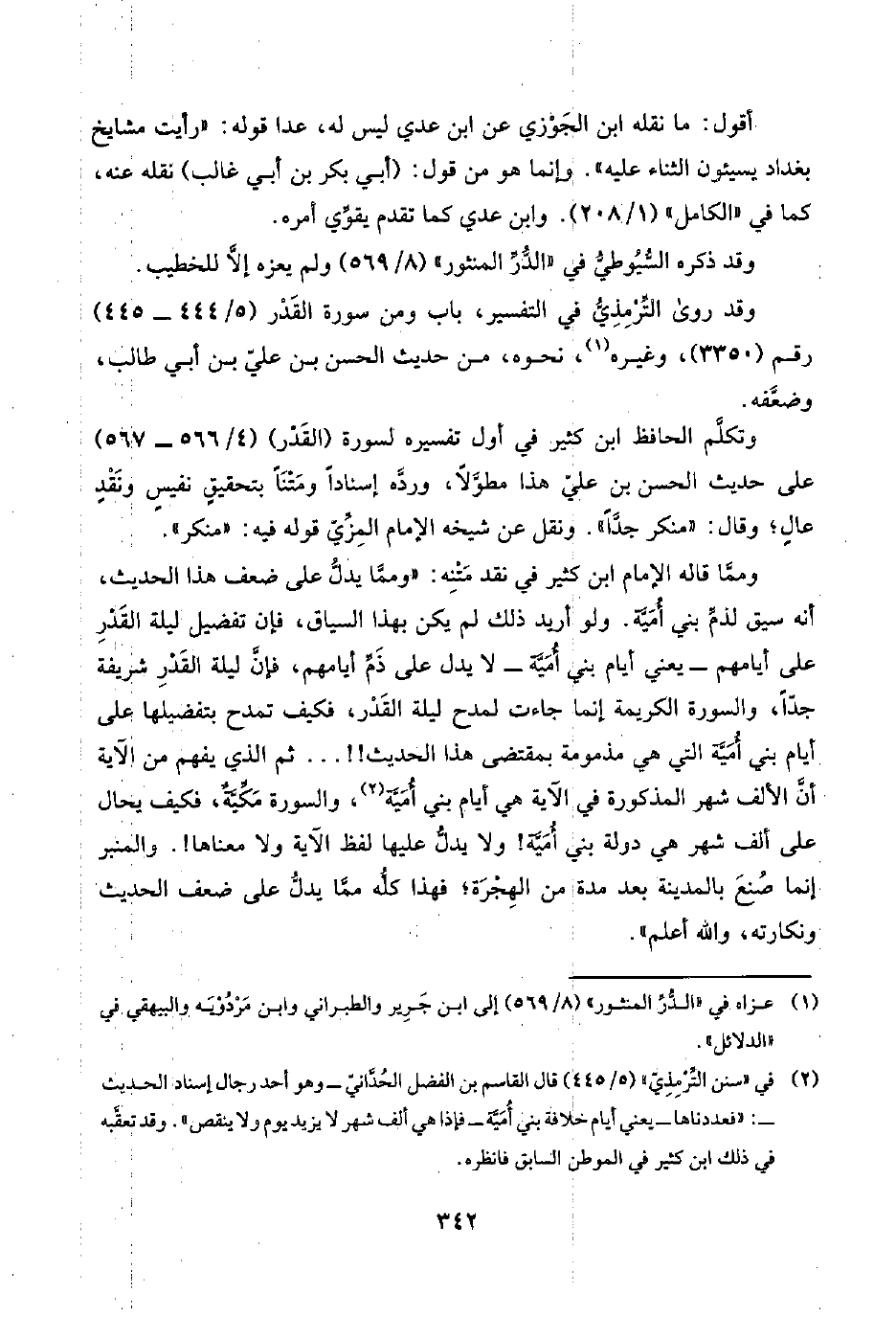 وممَّا قاله الإمام ابن كثير في نقد مَتْنِه: "وممَّا يدلُّ على ضعف هذا الحديث، أنه سيق لذمِّ بني أُمَيَّة. ولو أريد ذلك لم يكن بهذا السياق، فإن تفضيل ليلة القَدْرِ على أيامهم -يعني أيام بني أُمَيَّة- لا يدل على ذَمِّ أيامهم، فإنَّ ليلة القَدْرِ شريفة جدًّا، والسورة الكريمة إنما جاءت لمدح ليلة القَدْر، فكيف تمدح بتفضيلها على أيام بني أُمَيَّة التي هي مذمومة بمقتضى هذا الحديث! ! . . . ثم الذي يفهم من الآية أنَّ الألف شهر المذكورة في الآية هي أيام بني أُمَيَّة (¬٢)، والسورة مَكِّيَّةٌ، فكيف يحال على ألف شهر هي دولة بني أُمَيَّة! ولا يدلُّ عليها لفظ الآية ولا معناها! . والمنبر إنما صُنعَ بالمدينة بعد مدة من الهِجْرَة؛ فهذا كلُّه ممَّا يدلُّ على ضعف الحديث ونكارته، واللَّه أعلم.