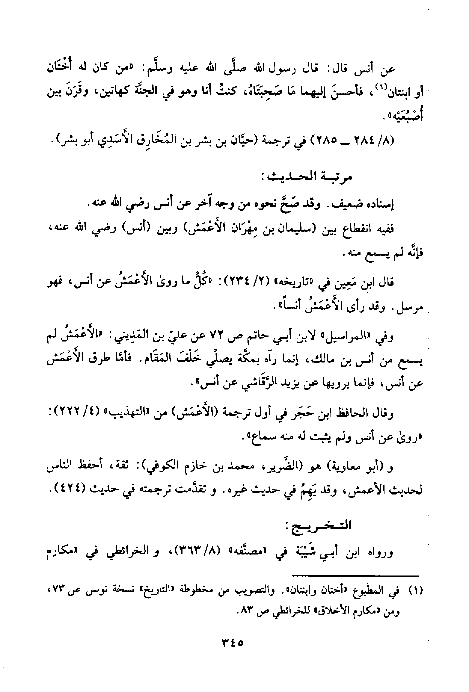 (¬١) في المطبوع "أختان وابنتان". والتصويب من مخطوطة "التاريخ" نسخة تونس ص ٧٣، ومن "مكارم الأخلاق" للخرائطي ص ٨٣.