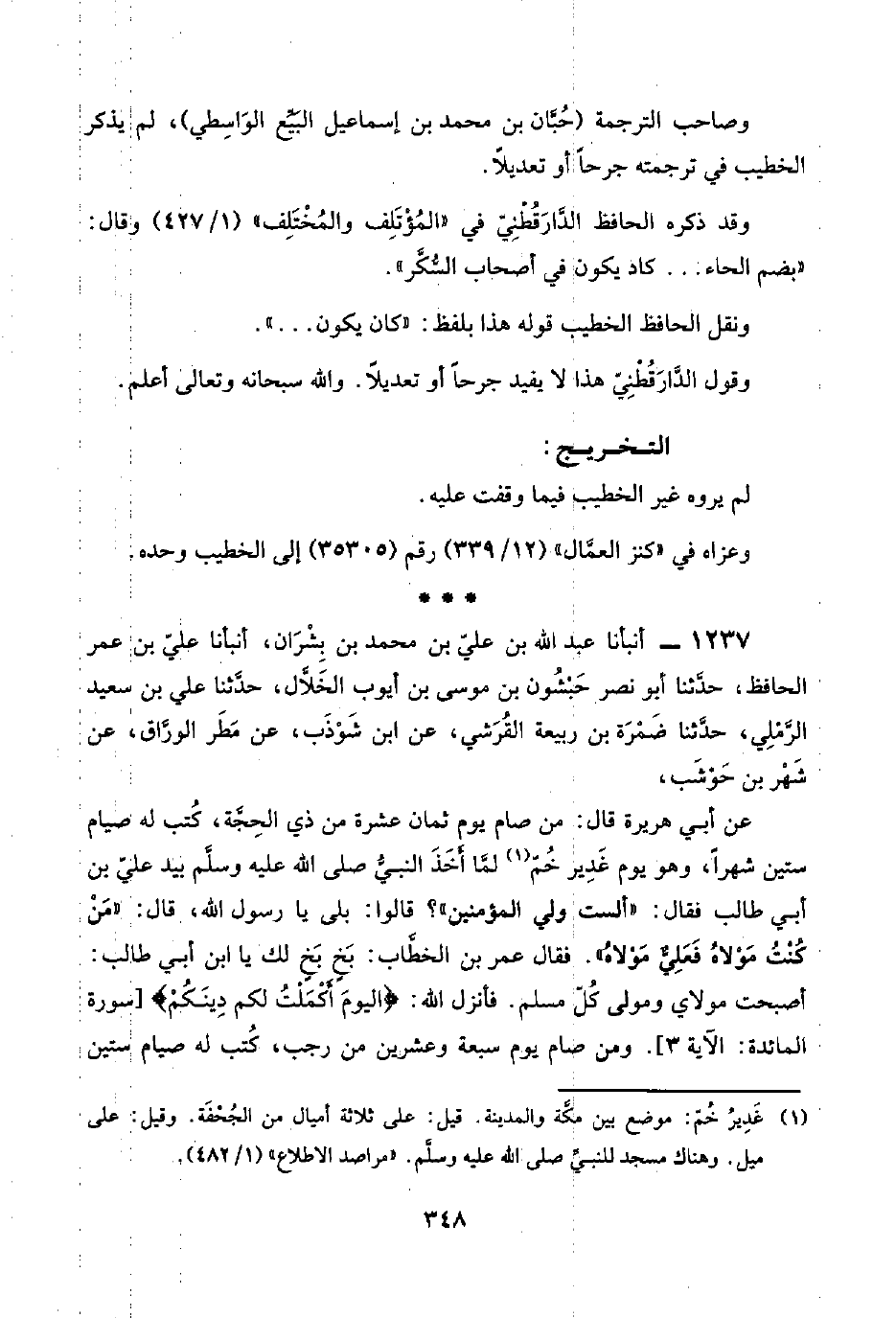 (¬١) غَدِيرُ خُمّ: موضع بين مكَّة والمدينة. قيل: على ثلاثة أميال من الجُحْفَة. وقيل: على ميل. وهناك مسجد للنبيِّ صلى اللَّه عليه وسلَّم. "مراصد الاطلاع" (١/ ٤٨٢)