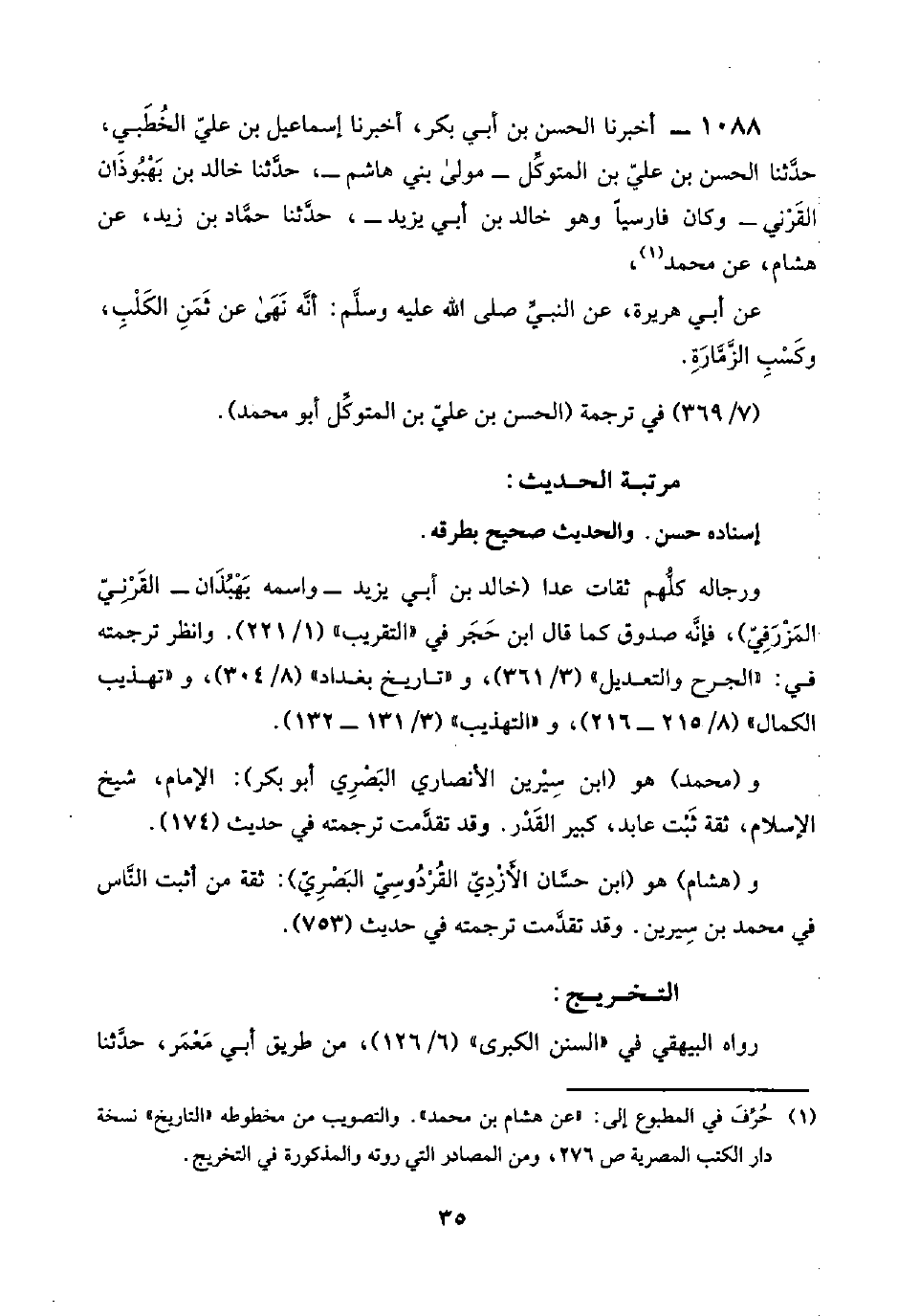 ١٠٨٨ - أخبرنا الحسن بن أبي بكر، أخبرنا إسماعيل بن عليّ الخُطَبي، حدَّثنا الحسن بن عليّ بن المتوكِّل -مولى بني هاشم-، حدَّثنا خالد بن بَهْبُوذَان القَرْني -وكان فارسيًا وهو خالد بن أبي يزيد-، حدَّثنا حمَّاد بن زيد، عن هشام، عن محمد (¬١)،