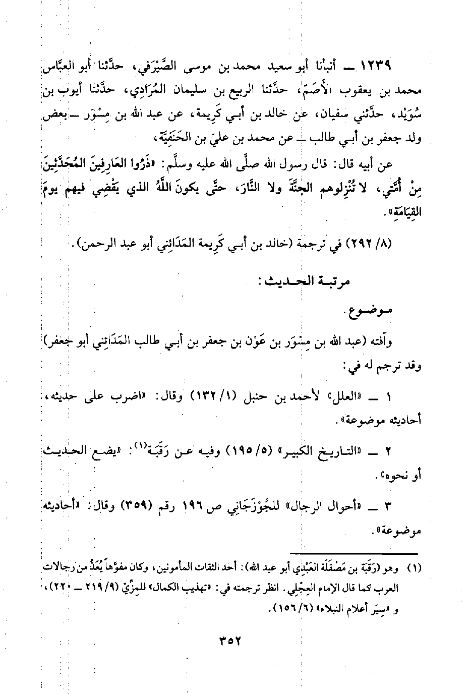 ١٢٣٩ - أنبأنا أبو سعيد محمد بن موسى الصَّيْرَفي، حدَّثنا أبو العبَّاس محمد بن يعقوب الأَصَمّ، حدَّثنا الربيع بن سليمان المُرَادِي، حدَّثنا أيوب بن سُوَيْد، حدَّثني سفيان، عن خالد بن أبي كَرِيمة، عن عبد اللَّه بن مِسْوَر -بعض ولد جعفر بن أبي طالب- عن محمد بن عليّ بن الحَنَفِيَّة،