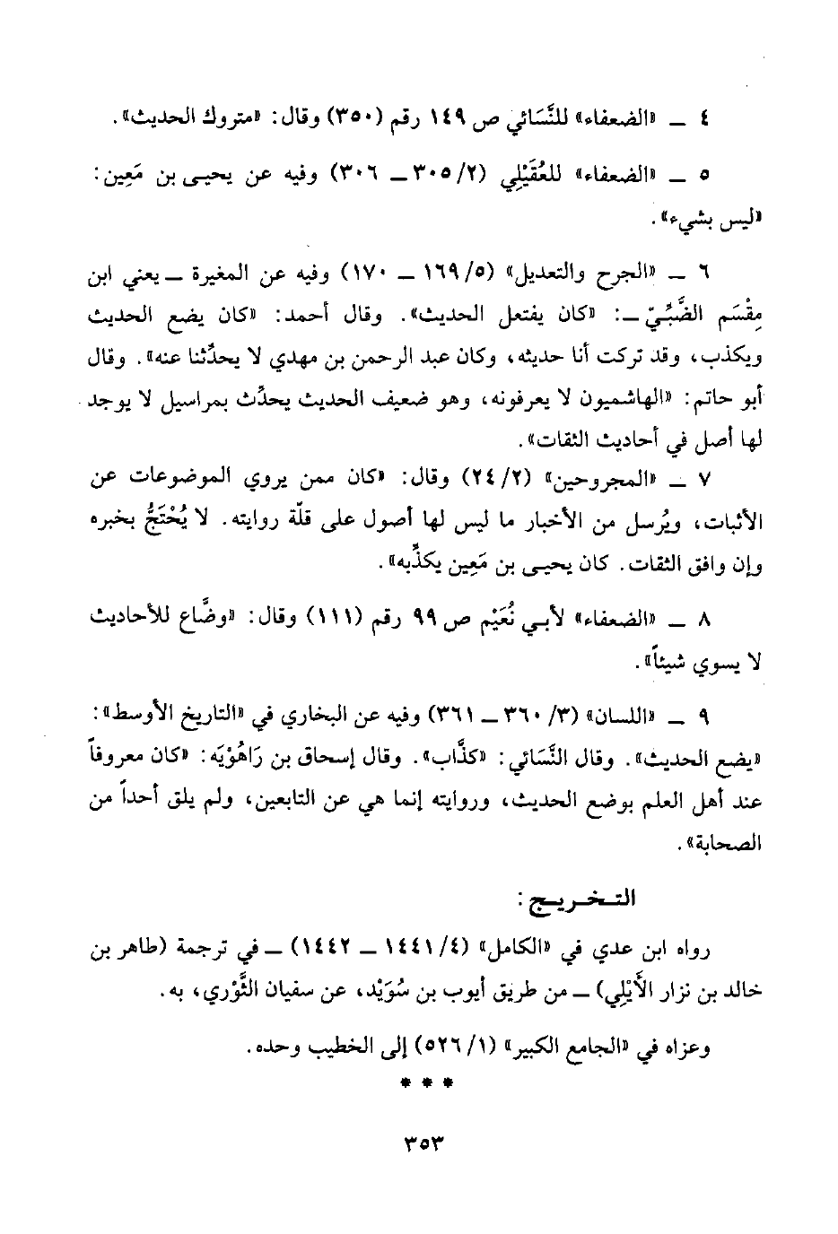 ٦ - "الجرح والتعديل" (٥/ ١٦٩ - ١٧٠) وفيه عن المغيرة -يعني ابن مِقْسَم الضَّبِّيّ-: "كان يفتعل الحديث". وقال أحمد: "كان يضع الحديث ويكذب، وقد تركت أنا حديثه، وكان عبد الرحمن بن مهدي لا يحدِّثنا عنه". وقال أبو حاتم: "الهاشميون لا يعرفونه، وهو ضعيف الحديث يحدِّث بمراسيل لا يوجد لها أصل في أحاديث الثقات".