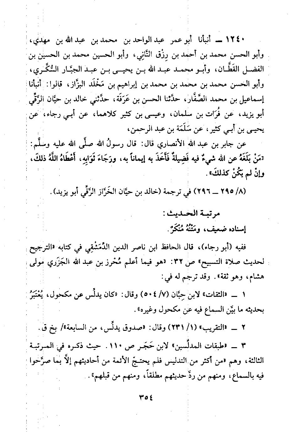 ١٢٤٠ - أنبأنا أبو عمر عبد الواحد بن محمد بن عبد اللَّه بن مهدي، وأبو الحسن محمد بن أحمد بن رِزْق التَّانِي، وأبو الحسين محمد بن الحسين بن الفضل القَطَّان، وأبو محمد عبد اللَّه بن يحيى بن عبد الجبَّار السُّكَّري، وأبو الحسن محمد بن محمد بن محمد بن إبراهيم بن مَخْلَد البزَّاز، قالوا: أنبأنا إسماعيل بن محمد الصَّفَّار، حدَّثنا الحسن بن عَرَفَة، حدَّثني خالد بن حيَّان الرَّقِّي أبو يزيد، عن فُرَات بن سلمان، وعيسي بن كثير كلاهما، عن أبي رجاء، عن يحيى بن أبي كثير، عن سَلَمَة بن عبد الرحمن،