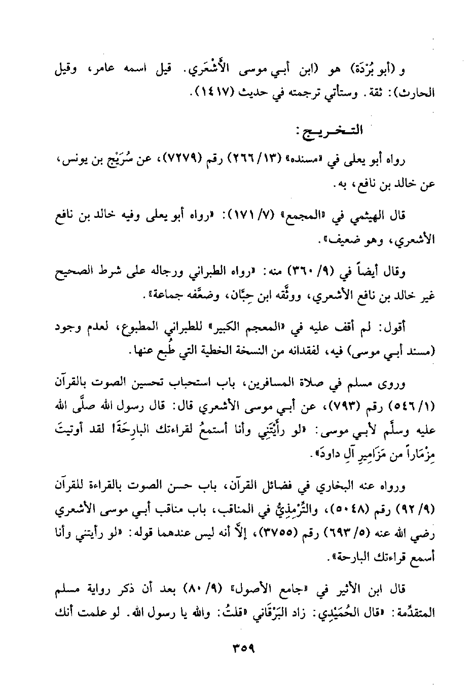 وروى مسلم في صلاة المسافرين، باب استحباب تحسين الصوت بالقرآن (١/ ٥٤٦) رقم (٧٩٣)، عن أبي موسى الأشعري قال: قال رسول اللَّه صلَّى اللَّه عليه وسلَّم لأبي موسى: "لو رأَيْتَنِي وأنا أستمعُ لقراءتك البارحَةَ! لقد أوتيتَ مِزْمَارًا من مَزَامِيرِ آلِ داودَ".